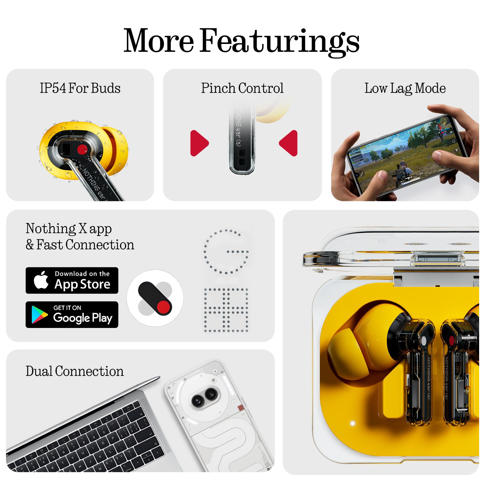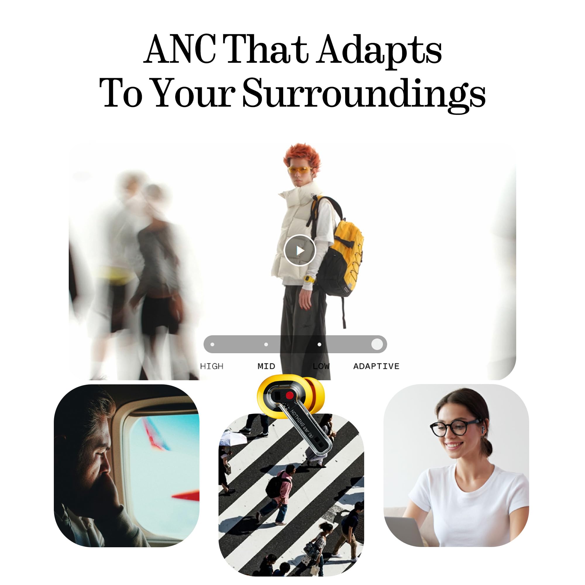 More Performance: Engineered for seamless versatility, Nothing Ear (a) wireless earbuds keeps you connected and immersed. Low Latency Mode ensures lag-free gaming, while dual-device connectivity lets you instantly switch between laptop and phone. Adaptive ANC intelligently adjusts to your surroundings or allows manual control through three noise cancellation levels—all via the Nothing X app.