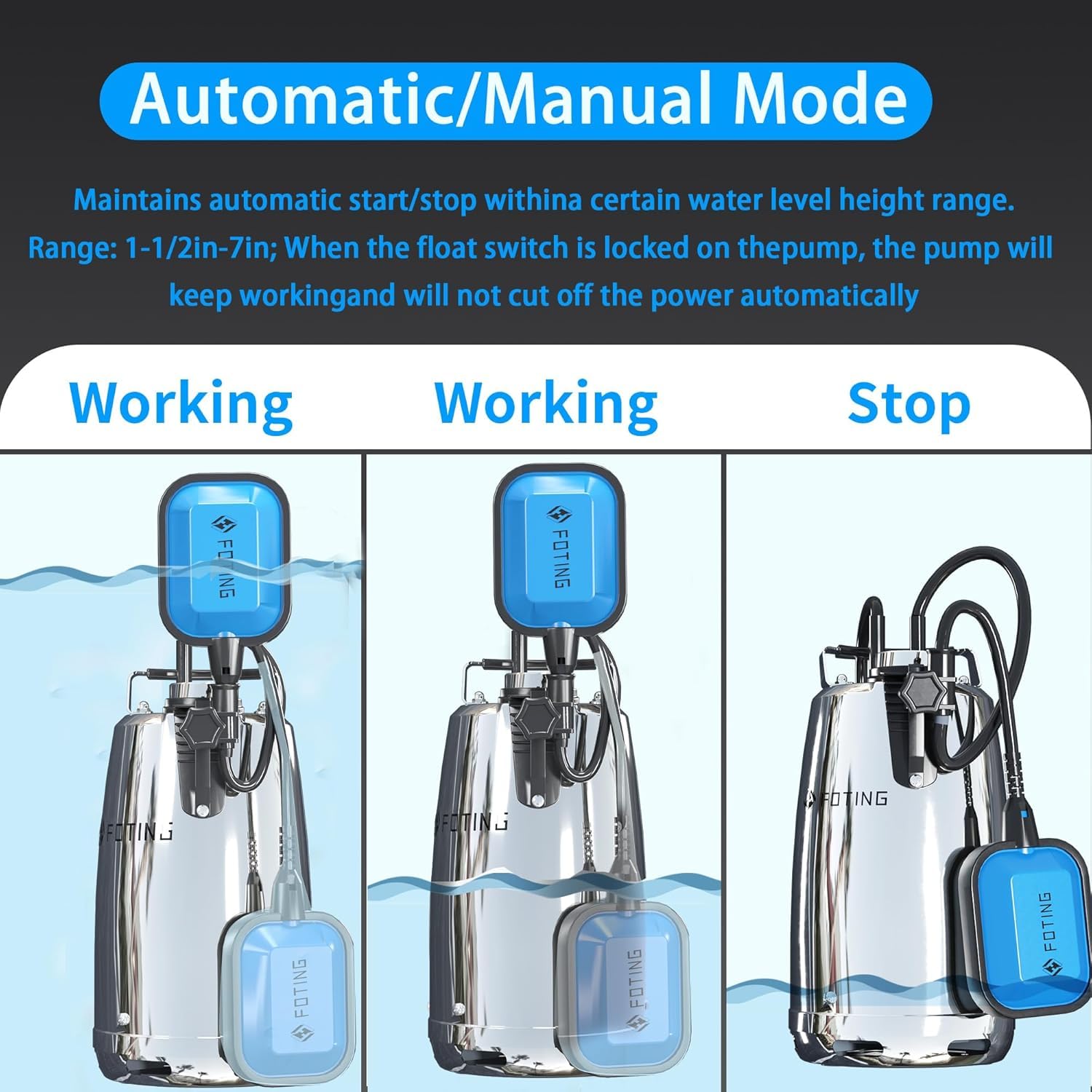 【MANUAL MODE】Easily lock the float switch to upright in the bracket and activate the manual mode. The unit will run continuously without turning off the power.*Removing water down to 1/5'' of the surface
