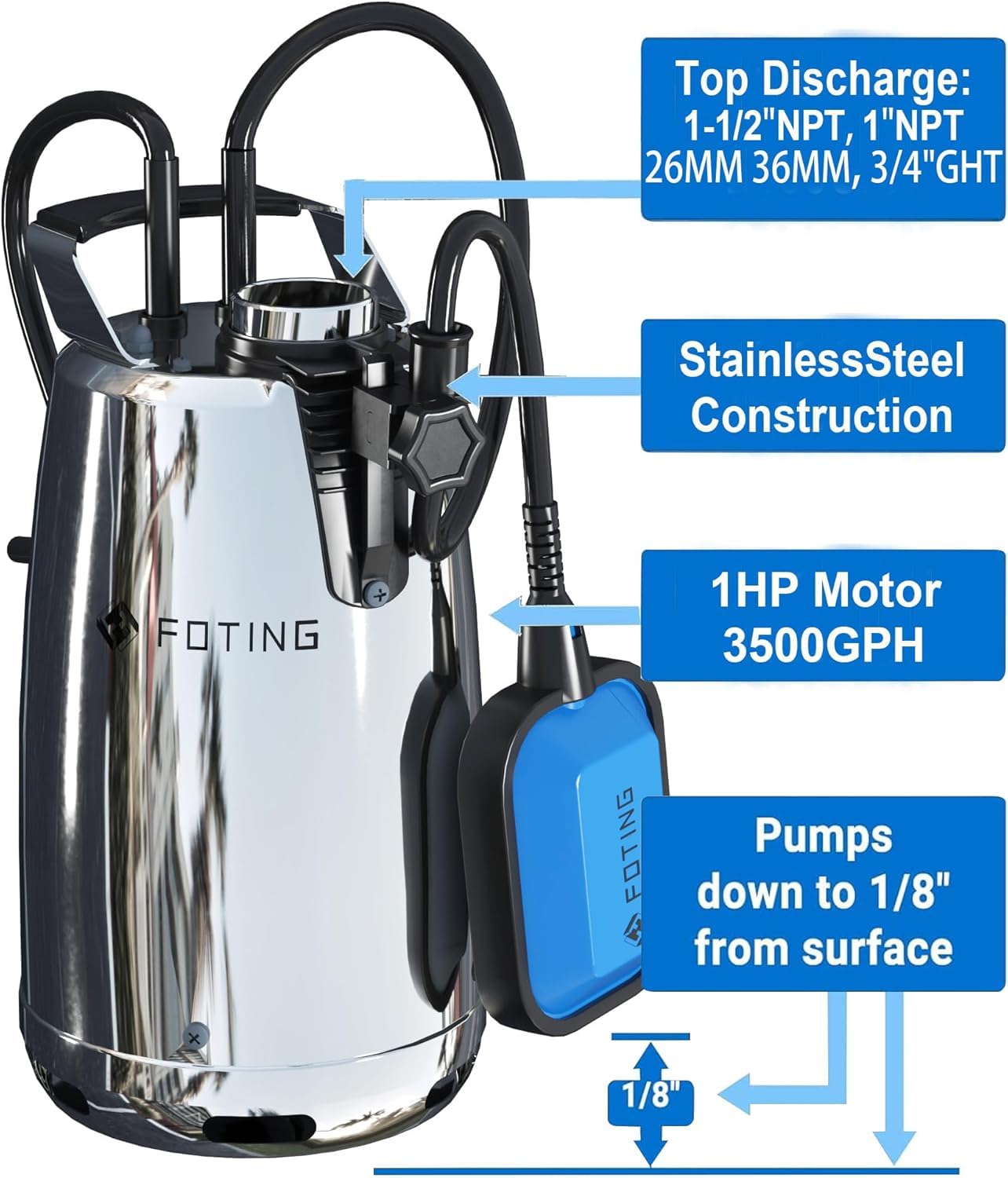 【FULL STAINLESS STEEL DESIGN】 Made of integrated 420 corrosion-resistant stainless steel, providing better cooling ability and durability. Thermal overload protection is suitable for continuous duty water removal and transfer work.