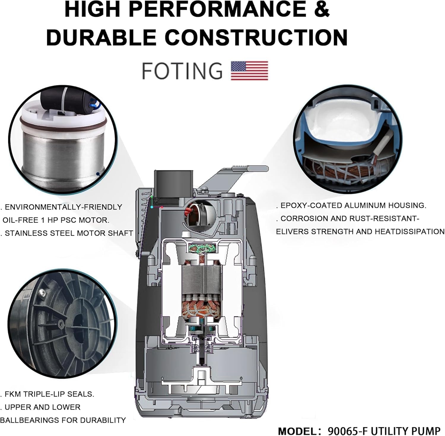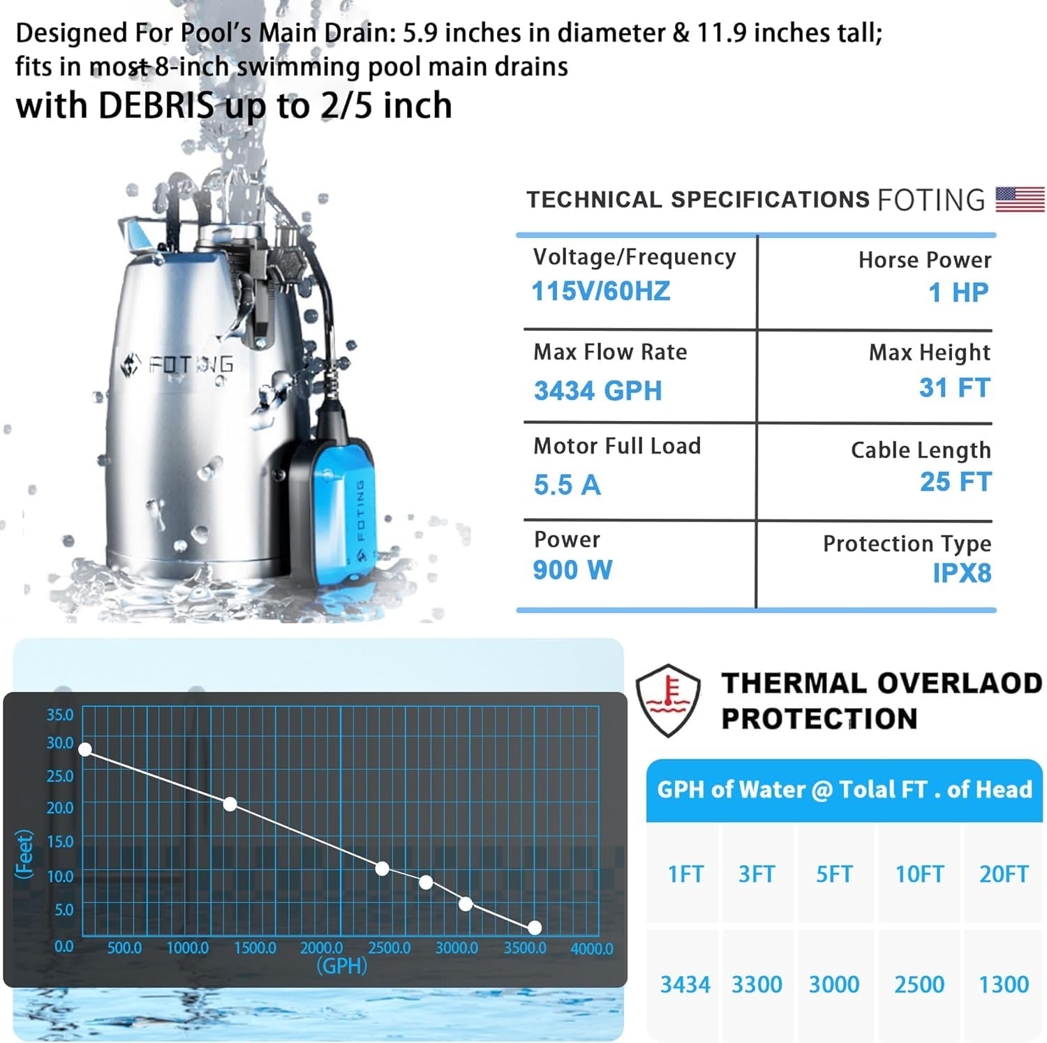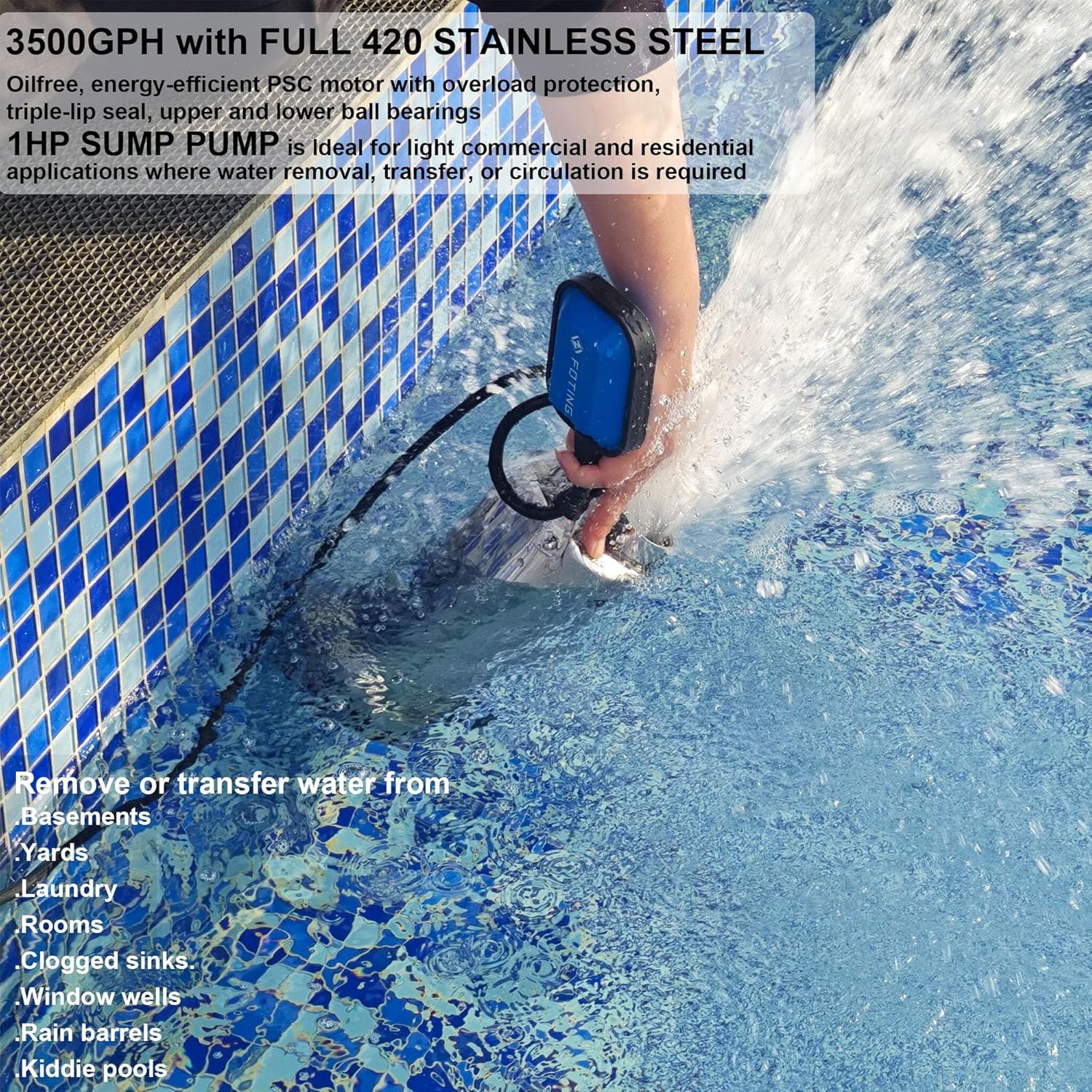 【1 HP Powerful Motor】Submersible water pump features an Oil free PSC motor for great performance and safty, lift water up to 31ft. max flow 3500GPH at 5ft discharge lift. Handle up to 2/5″solids.