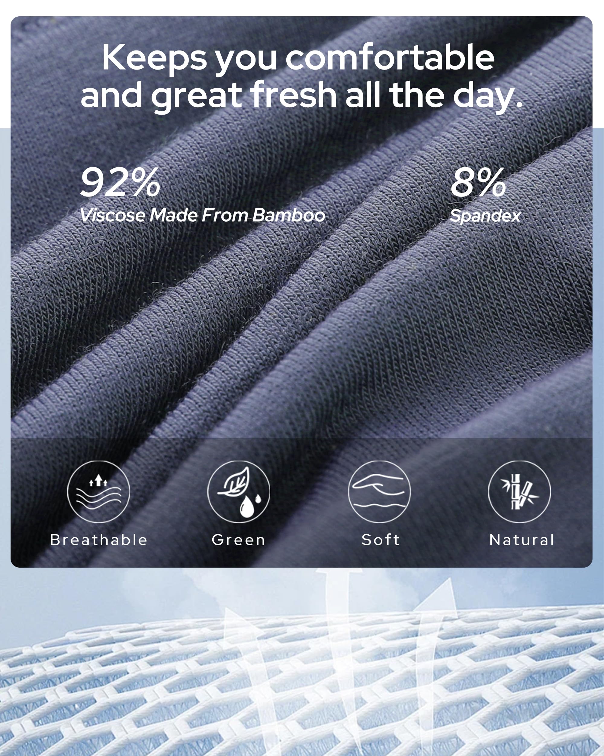 HIGH QUALITY FABRIC - Made of 92% viscose made from bamboo and 8% spandex. The fabric is soft and breathable, moisture wicking and sweat wicking, regulating temperature.