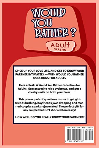 ★SPICE UP YOUR LOVE LIFE, AND GET TO KNOW YOUR PARTNER INTIMATELY — WITH STEAMY WOULD YOU RATHER QUESTIONS FOR ADULTS Here at last: A Would You Rather collection for Adults. Guaranteed to raise eyebrows, and put a cheeky smile on both your faces. This power pack of questions is sure to get girlfriends blushing, boyfriends jaws dropping and married couples sparks rejuvenated. The perfect gift for any couple that isn’t shocked too easily! 'CLICK BUY NOW' TO DISCOVER YOUR PARTNERS DEEPEST DESIRES