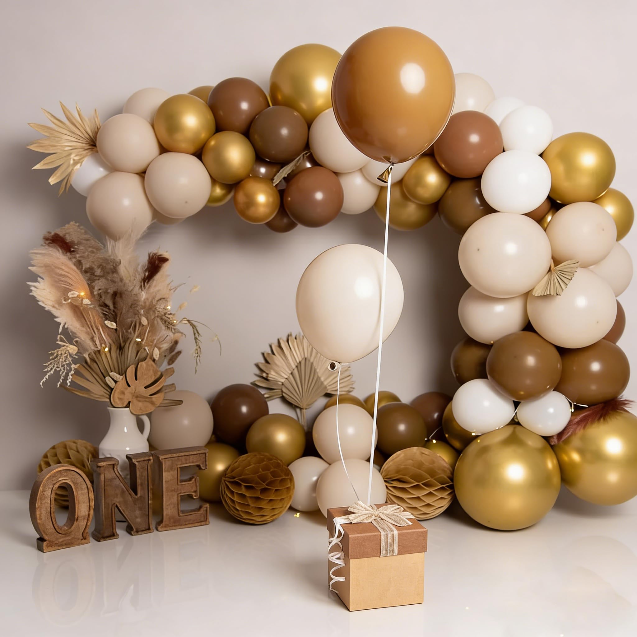 【Tips & Guarantee】Before inflation, sand white balloons are towards gray, brown balloons are towards dark brown tan , retro apricot balloons are towads orange, gold balloons are towards dark gold. After inflating, the balloons' colors will look more like the picture. If you are not satisfied with the quality and colors of the balloons, please contact us directly.