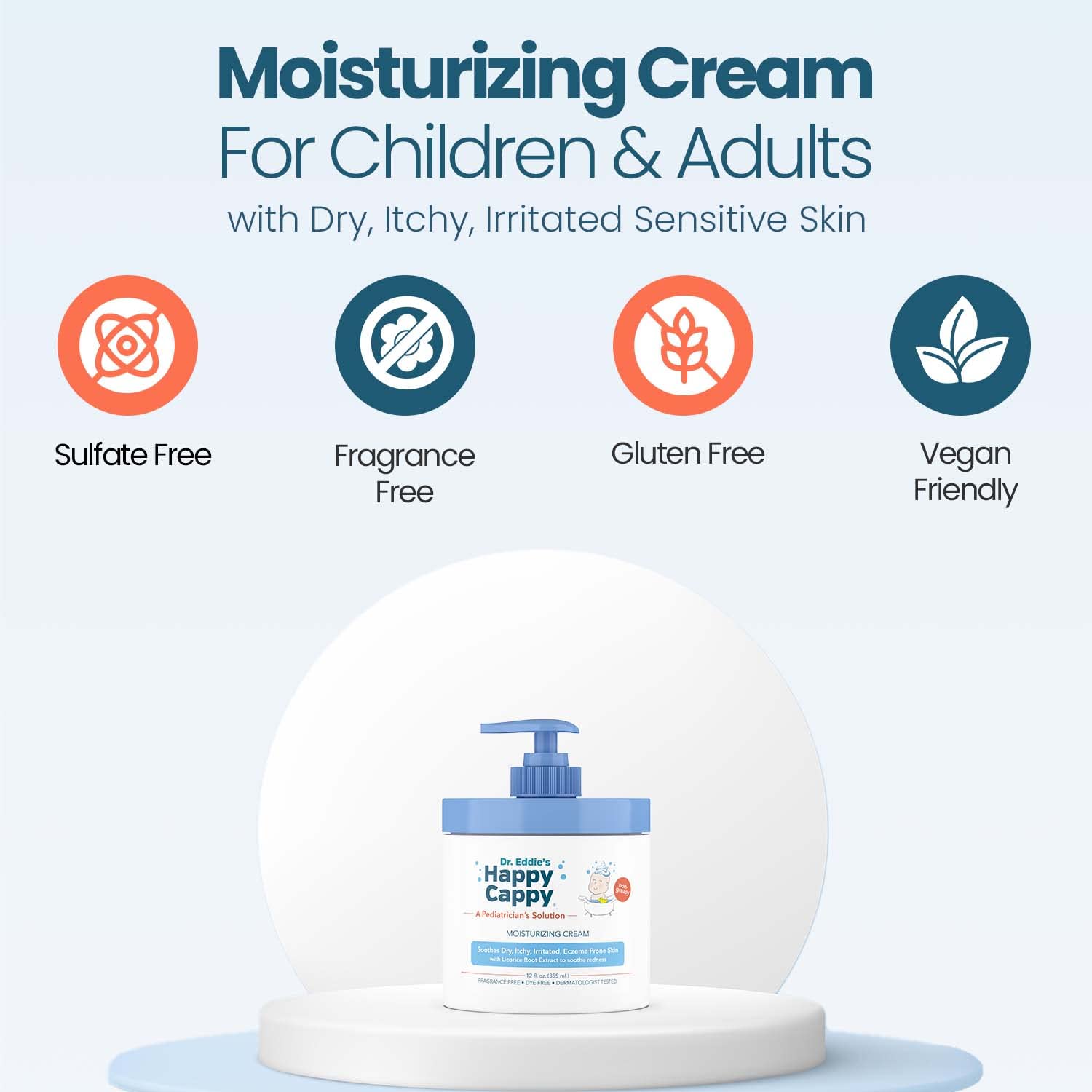 DESIGNED BY A PEDIATRICIAN - Happy Cappy’s moisturizing cream soothes dry, itchy, irritated, eczema-prone skin for children of all ages & is formulated to hydrate skin all day