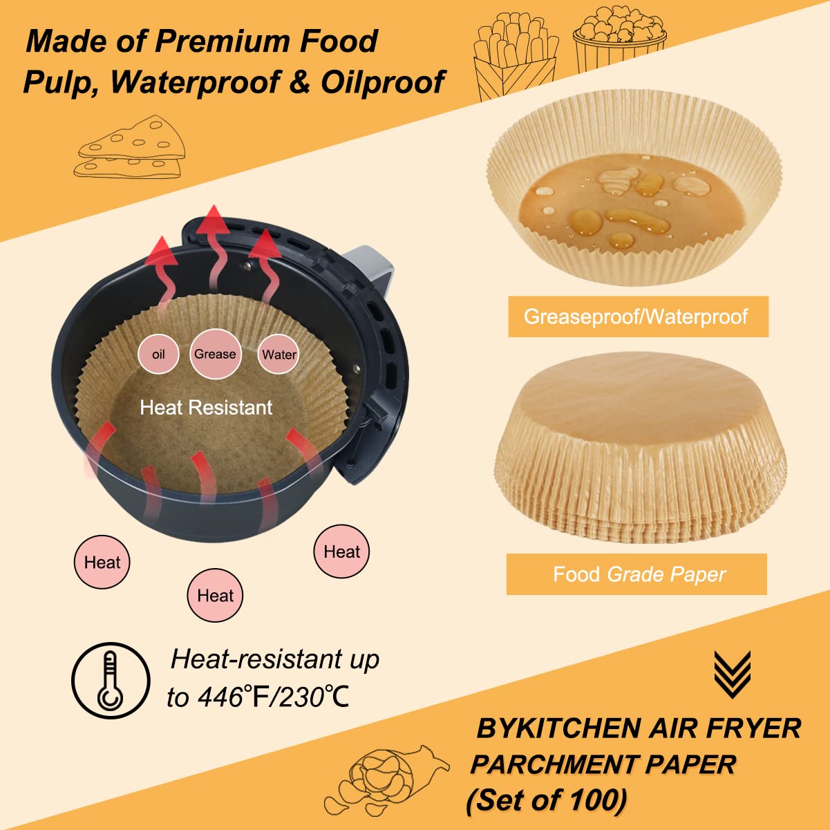 PREMIUM AIR FRYER PAPER LINER: Made from 100% food grade pulp with food grade nonstick coating, healthy, nonstick, grease-proof, waterproof, non-absorbent, 100% safe for daily use.