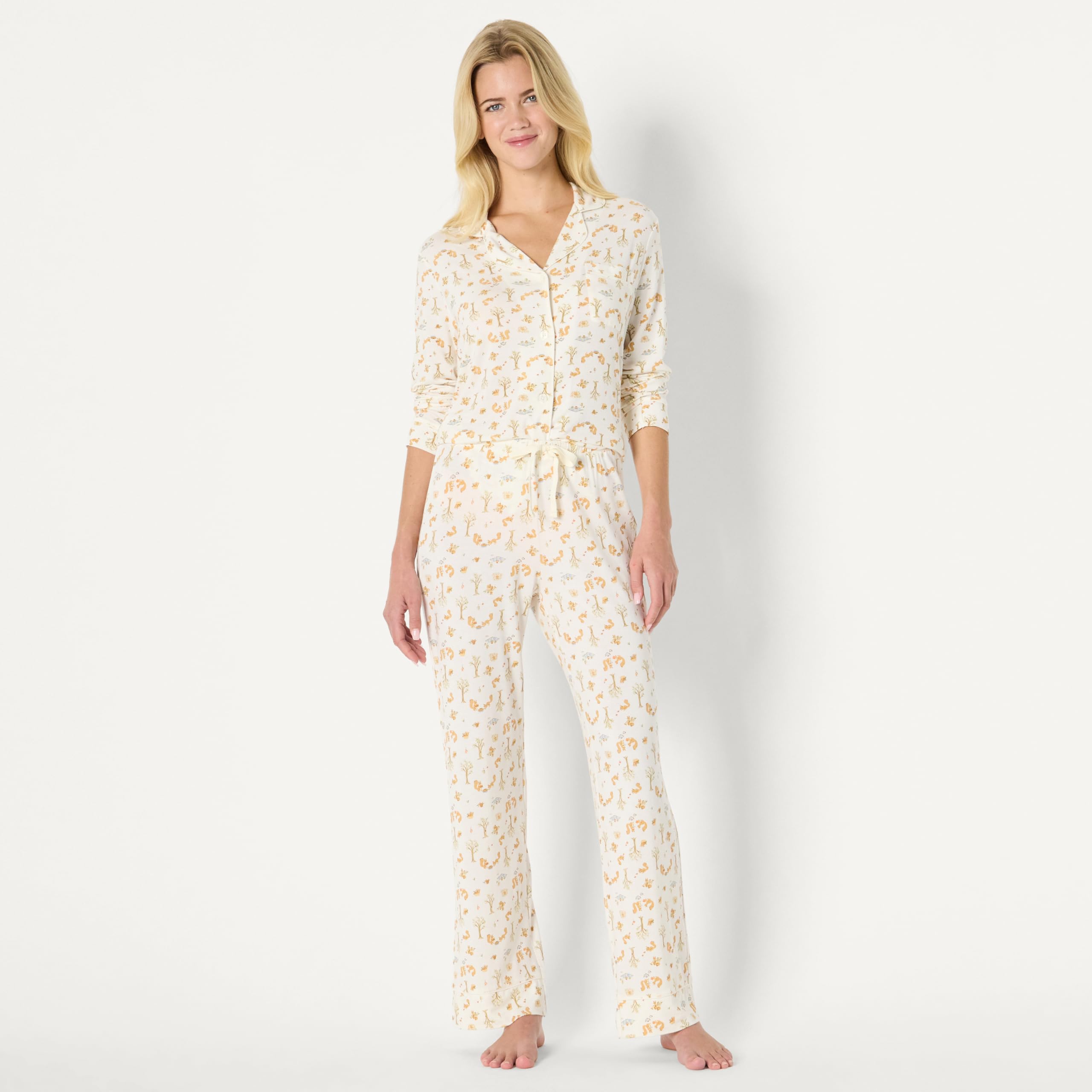 DETAILS: This set features a button-front long sleeve top with classic notch collar and single patch pocket. The pant is designed with an elasticated waistband. Modern framing with delicate contrast piping at sleeve and leg cuffs
