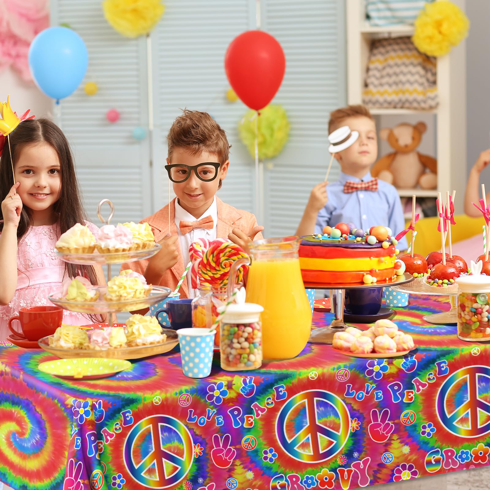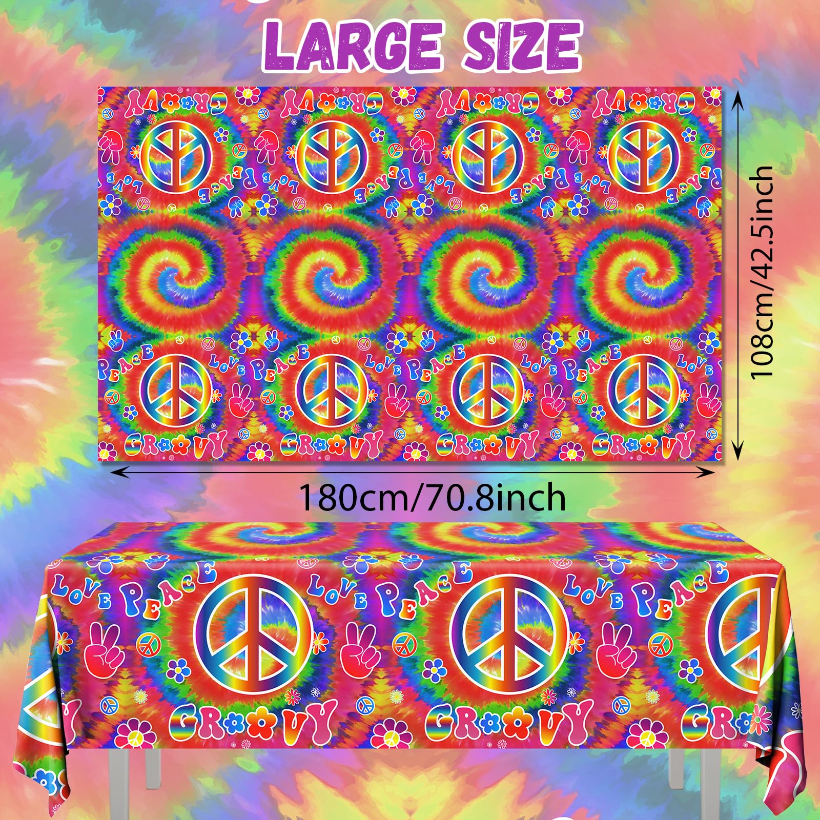 Widely Used: The rectangle groovy tablecloth is suitable for many occasions, such as indoor or outdoor retro 60s 70s party, Woodstock themed party, peace and love themed party, rainbow party, carnival groovy birthday party, tie dye themed party, friend gatherings, festivals and holiday, etc