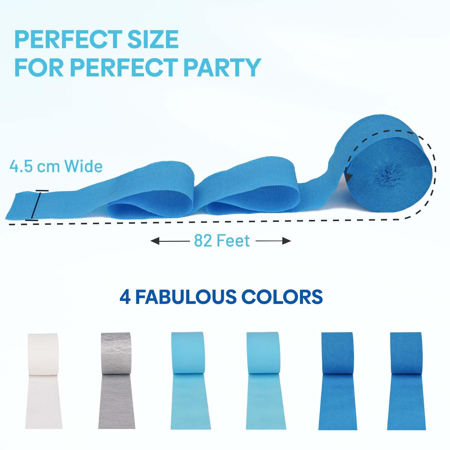 Vibrant Streamers Multipack: Our vibrant set of 6 crepe paper streamers, perfect for any festive decorations. Includes Bright White, Metallic Silver, Light Blue, Cobalt Blue. for birthday and party decorations. Each roll 82 ft long and 1.8" wide.