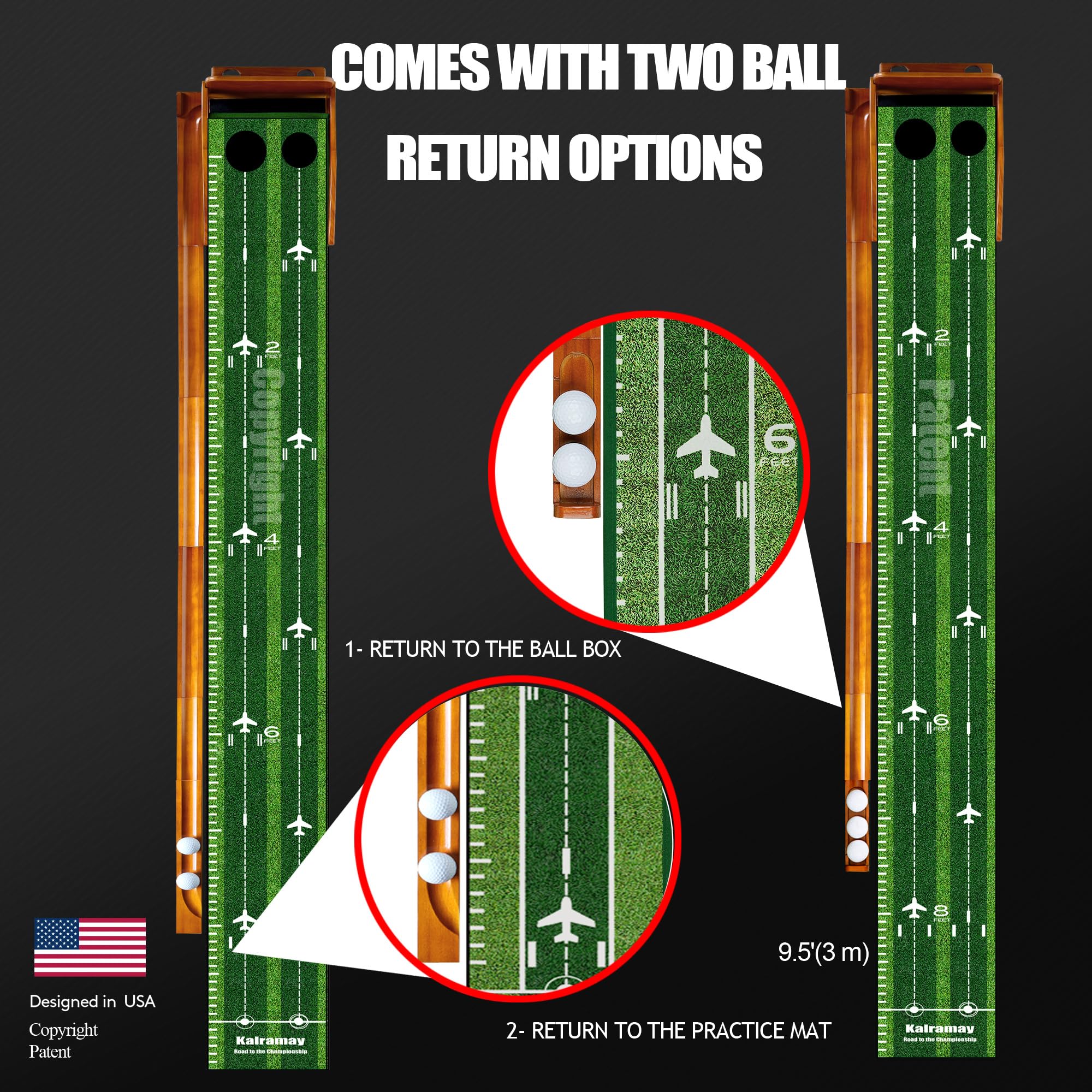 【Effortless Ball Return for Efficient Practice】: Experience the ultimate convenience with the Kalramay golf putting mat dual ball return system. Its non-humping, natural rubber mat includes realistic auxiliary lines and distance markers, simulating real-course challenges. The built-in automatic ball return and ball storage box (featuring both curved return and storage options) ensure uninterrupted, enjoyable practice sessions every time.(No practice ball included)