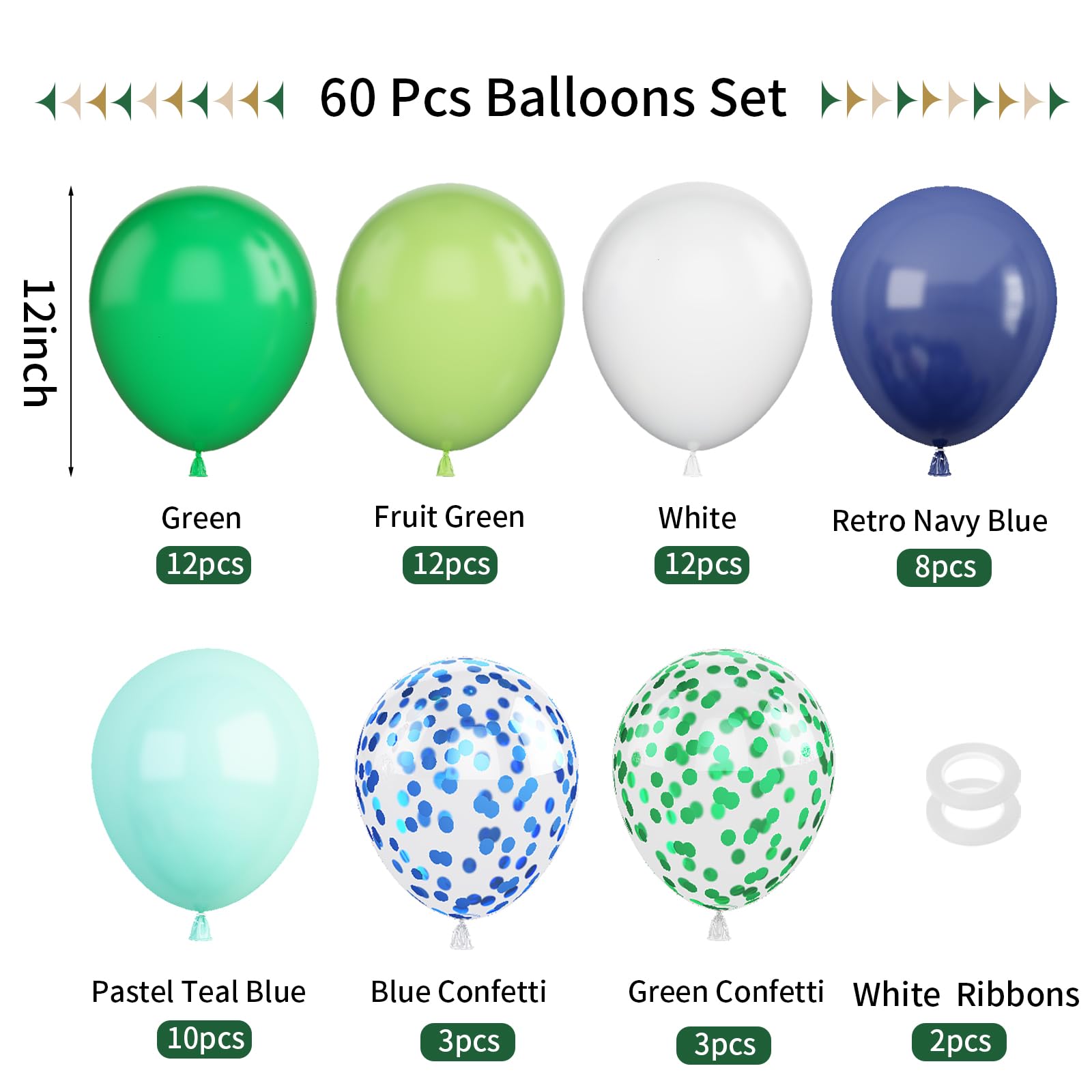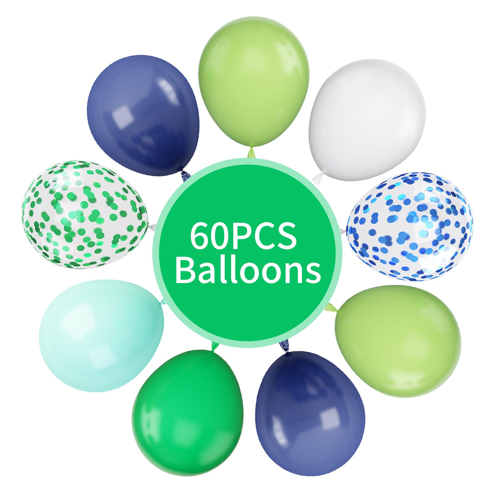 Package Included : Our blue green balloons set includes: 12 pcs fruit green balloons, 12 pcs green balloons, 12 pcs white balloons, 10 pcs teal balloons, 8 pcs navy blue balloons, 6 pcs green and blue confetti balloons and 2 pcs ribbons