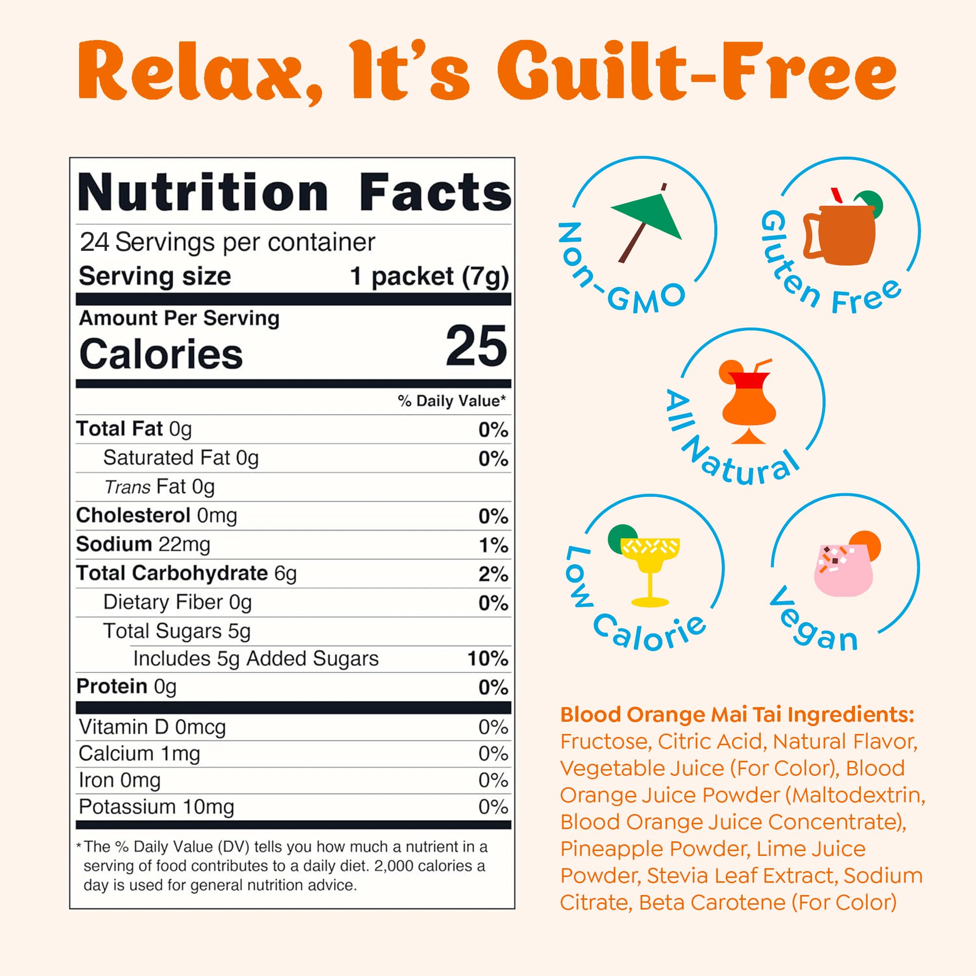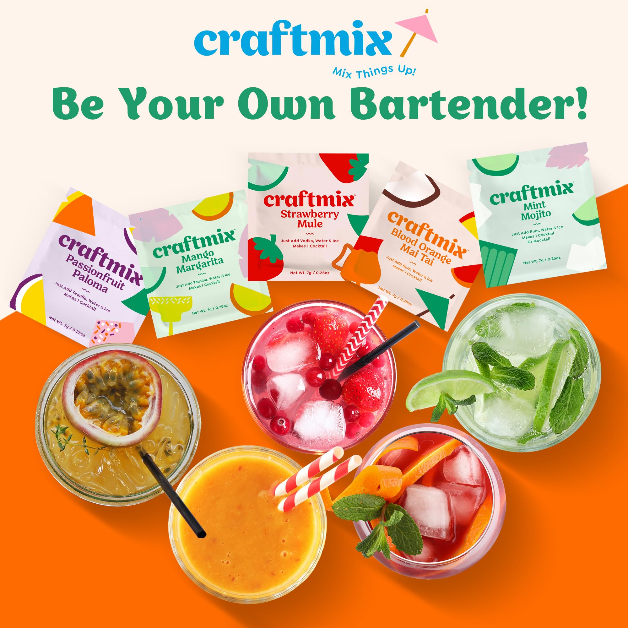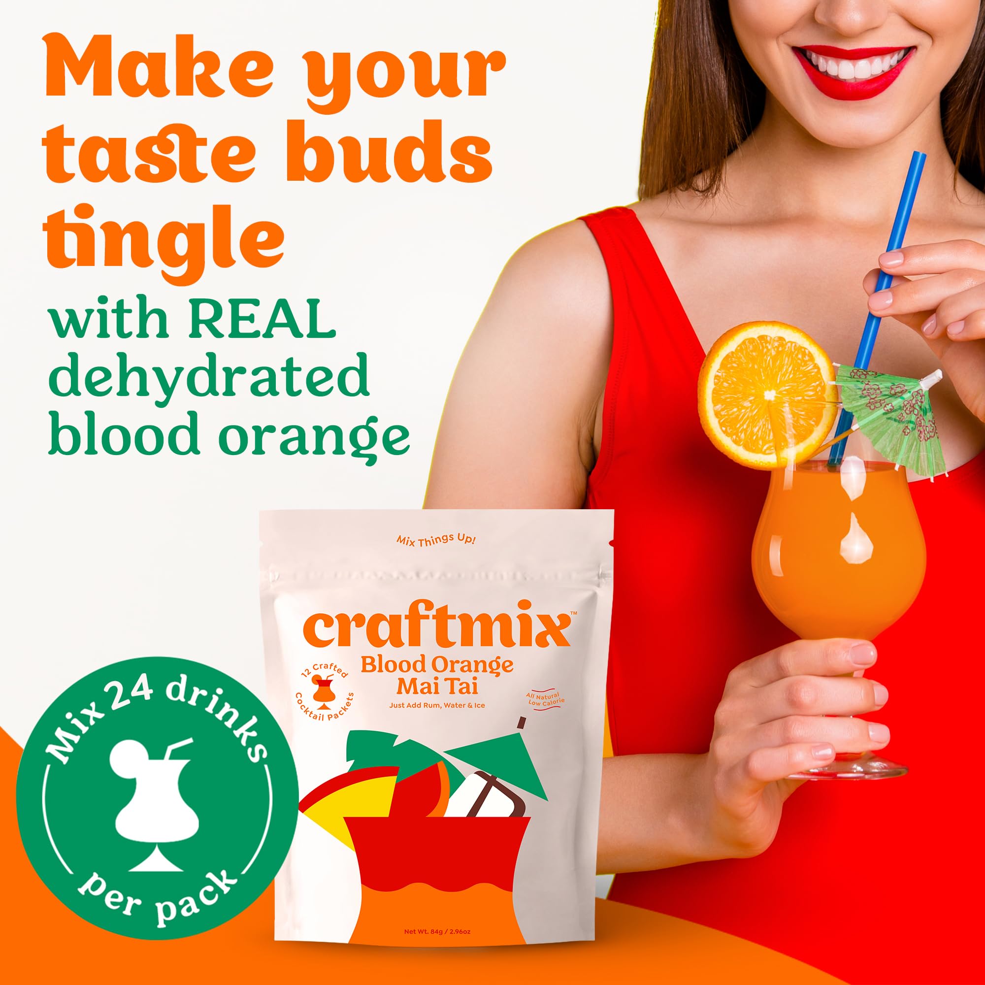 Blood Orange Mai Tai Cocktail Mixer: With Craftmix just add rum, sparkling or still water, and ice to savor the tropical fruity taste of this fat free, low calorie alcohol drink mixer made with natural ingredients in 60 seconds or less anytime, anywhere. Pack makes 24 Drinks.