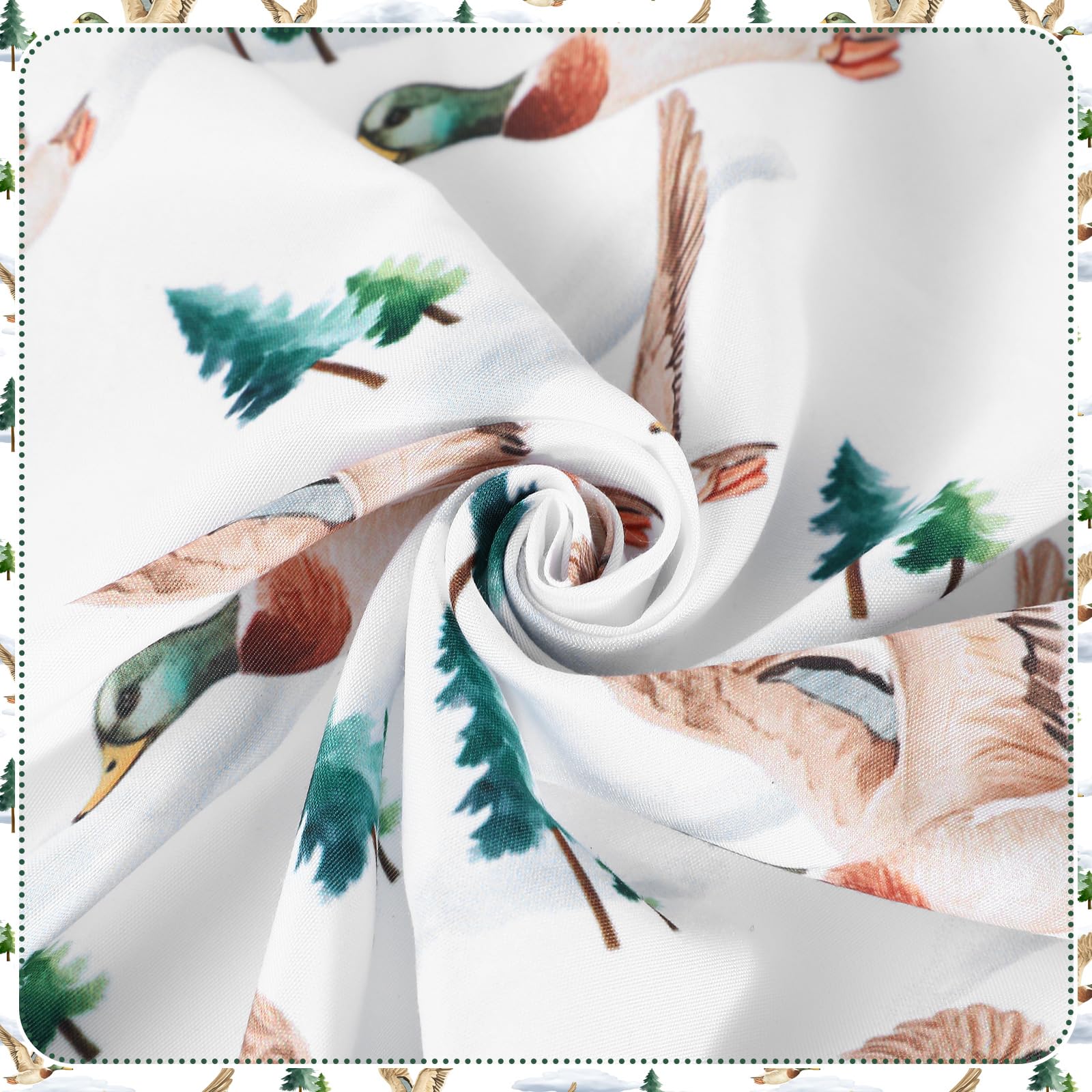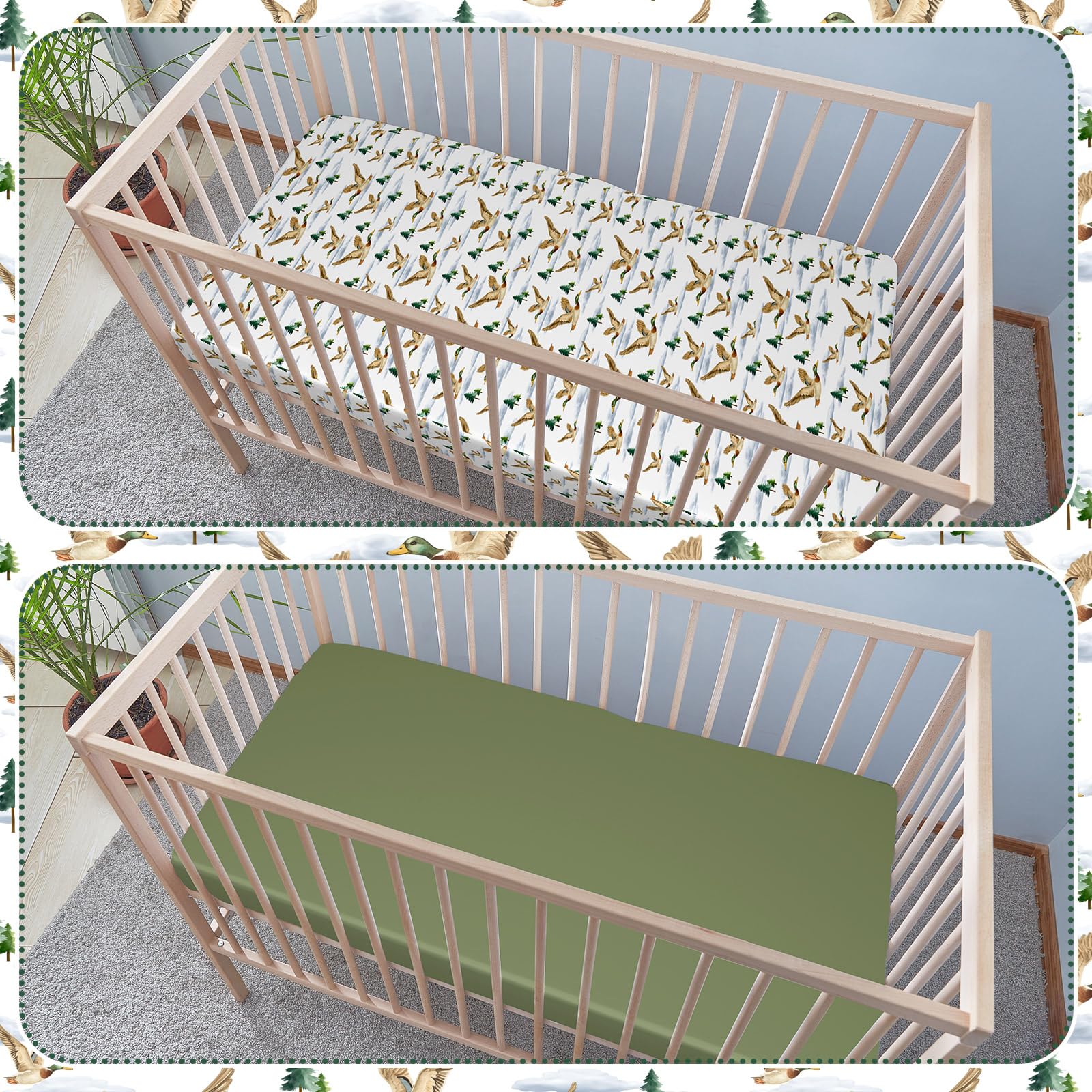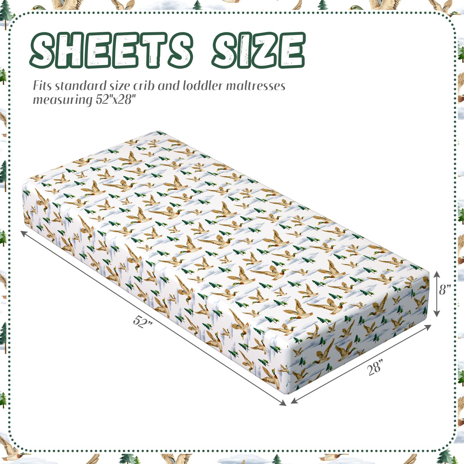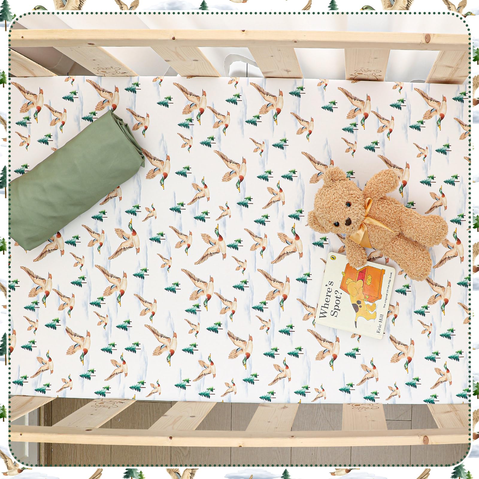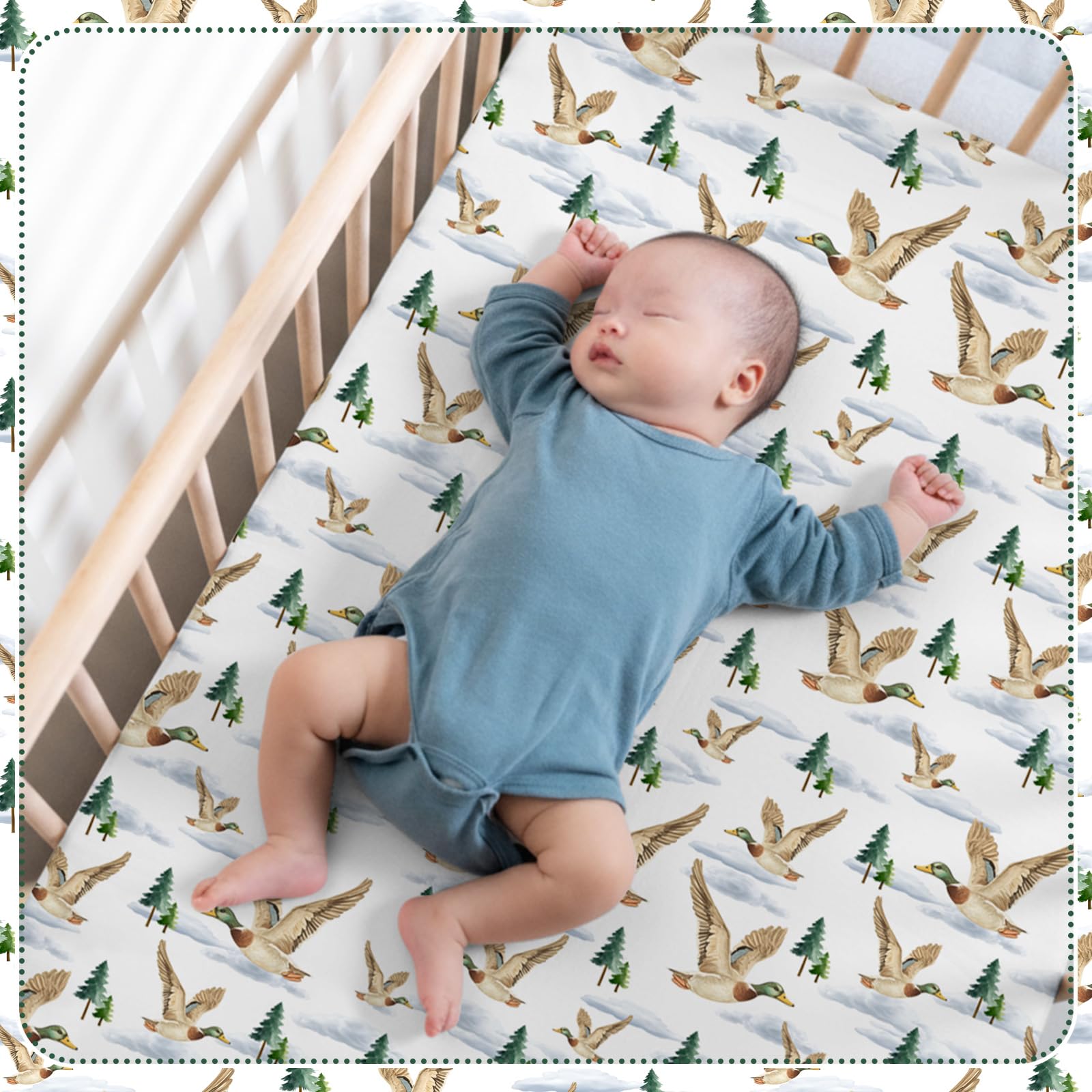 Mallard Duck Bed Sheet Set: includes 2 pcs baby bed sheets compatible with a 52" x 28" standard baby mattress; 4 sided elastic edging design, paired with an 8 inch deep pocket, provides a secure fit that is not easily displaced; 2 pcs bed sheet configuration, easy to change and wash, keep clean and ready for use at any time; Practical and thoughtful, creating a comfortable and reassuring sleeping space for babies