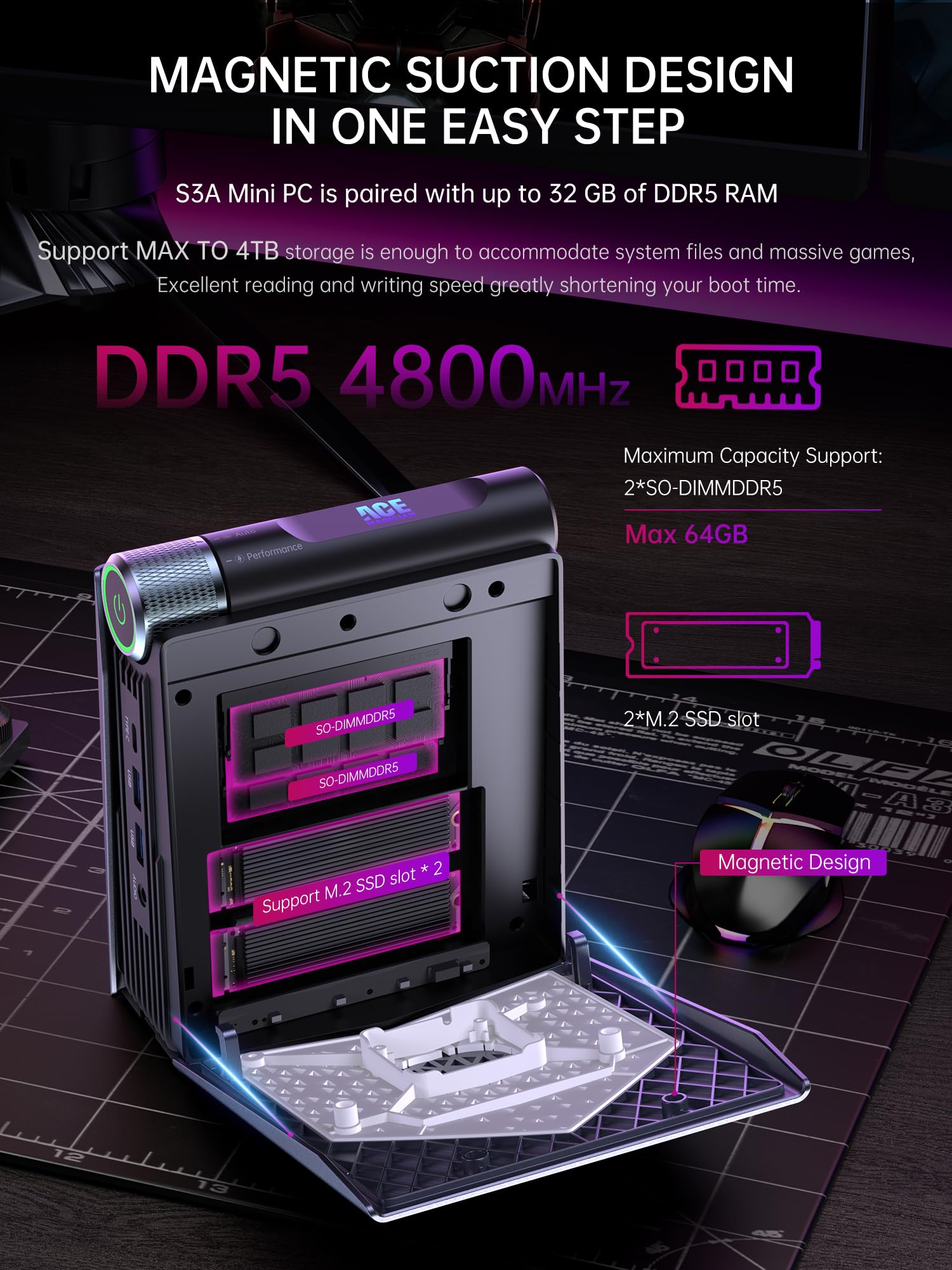 Faster Than Ever Before: Equipped with DDR5 slots and 4800MHz memory, ACEMAGICIAN Mini PC is 50% faster than the previous generation. Plus, the 512GB M.2 2280 NVMe SSD provides data transmission speeds that are 20 times faster than ordinary SATA SSDs. The 16GB DDR5 and 512GB NVMe SSD ensure lightning-fast loading times and smooth gameplay.