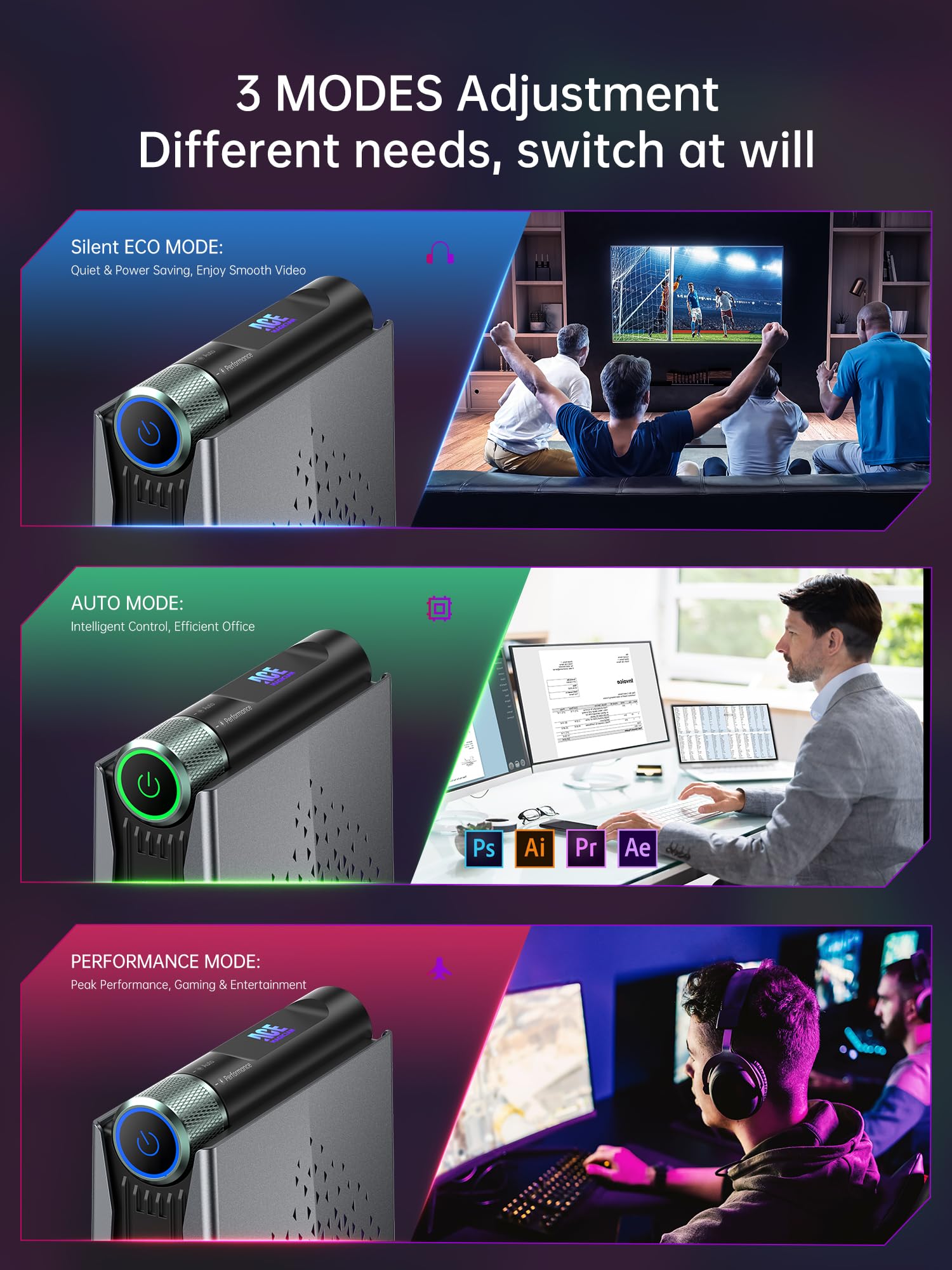 Customizable Modes for Any Need: hoose from three different modes to optimize your experience: Silent mode for quiet streaming or light work, Auto mode for medium work or entertainment projects, and Performance mode for the toughest and most intense game graphics.