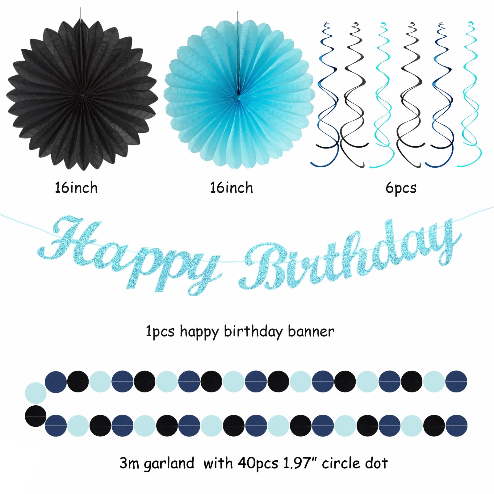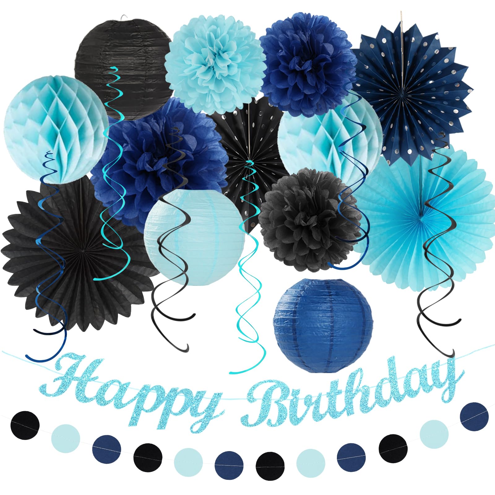 【Light royal navy dusty blue black Birthday kits】This kits include 1pcs happy birthday banner, 1pcs circle dots paper banner, 4pcs tissue pom poms: 3pcs 10" and 1pcs 12" , 3pcs 8inch paper honeycom ball, 2pcs 8inch paper lantern, 4pcs 12inch paper flower fan, 6pcs Paper swirls hanging streamers. 【Unique Birthday Party Decoration design】Blue black color, use our high-quality birthday decorations at your party table and give your guests the details they deserve. It will be a great addition to your adult birthday theme party. 【Wide Application】This birthday party decorations kit have been used for all kinds of birthday parties for men and boys between 1st, 13th, 15th, 16th, 18th, 20th, 21st, 25th, 30th, 35th, 40th, 45th, 50th, 55th, 60th, 70th, 80th, 90th, 100th birthday party decorations,nautical party decorations, blue birthday decorations,ocean birthday party decorations,dallas cowboys birthday decorations. 【Easy to Assemble】The paper fan and paper lanterns are easy assemble, the birthday banners can be diy, the circle dots paper banner has been assembled but tissue paper pompoms take more time to put together, please diy with the instructions. It will take about 20 minutes in total. 【Quality Guarantee】If you are not satisfied with the color, quality or other aspects,please contact us for a refund or replacement. We have a 30 day refund guarantee for every order.