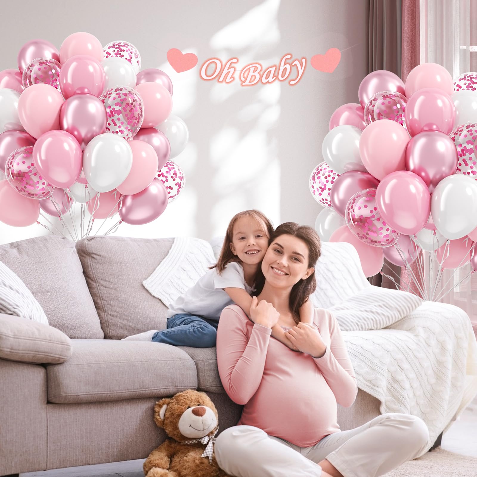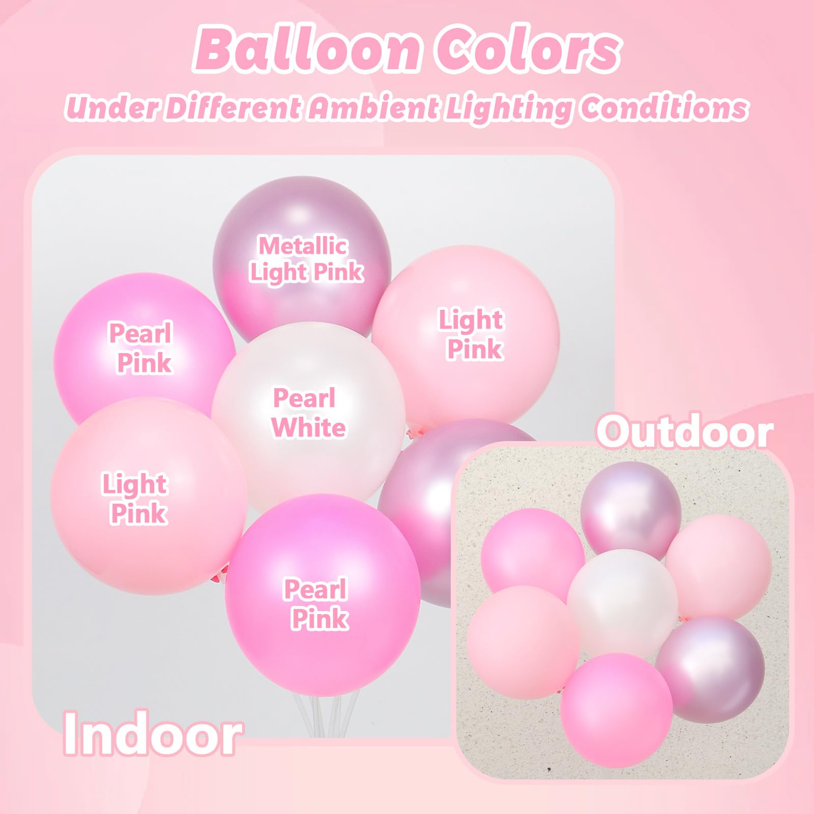 Package Include: 12inch light pink balloons x15, 12inch pearl pink balloons x10, 12inch pearl white balloons x15, 12inch pink confetti balloons x10, 10inch metallic light pink balloons x10, ribbon x1, glue dot x20