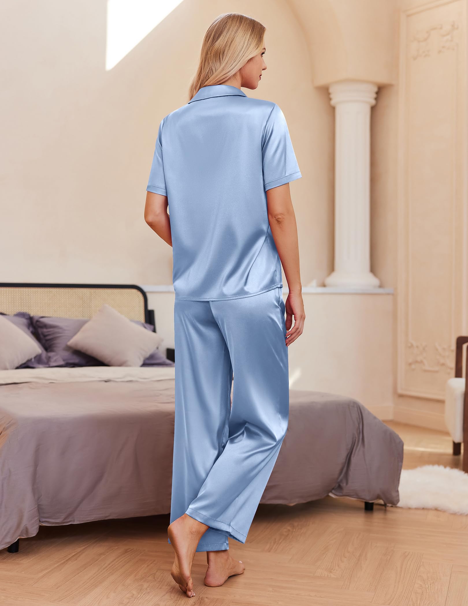 Material: Silk pajama set is made of premium lightweight, breathable and skin-friendly fabric, just like wrapped in a cloud, helping you have a sound sleep