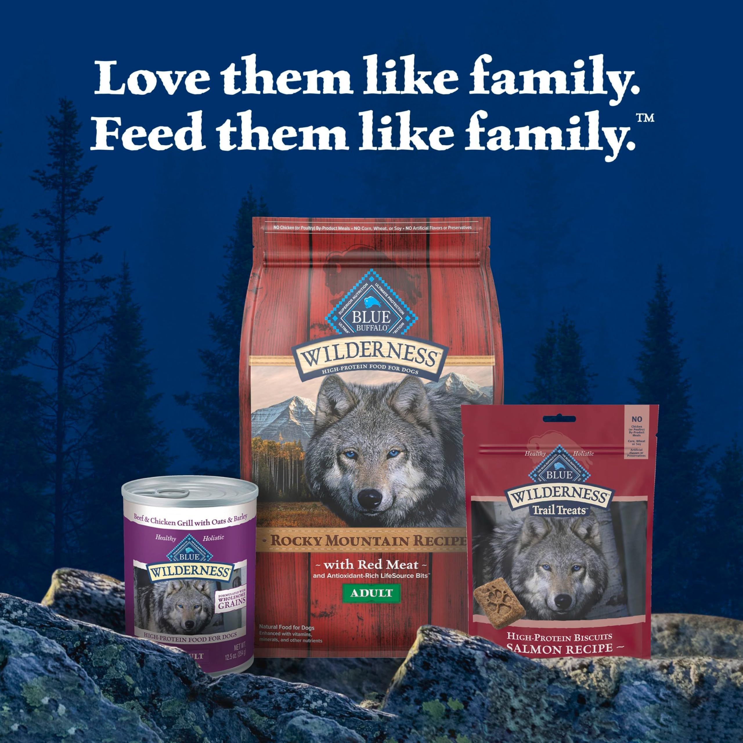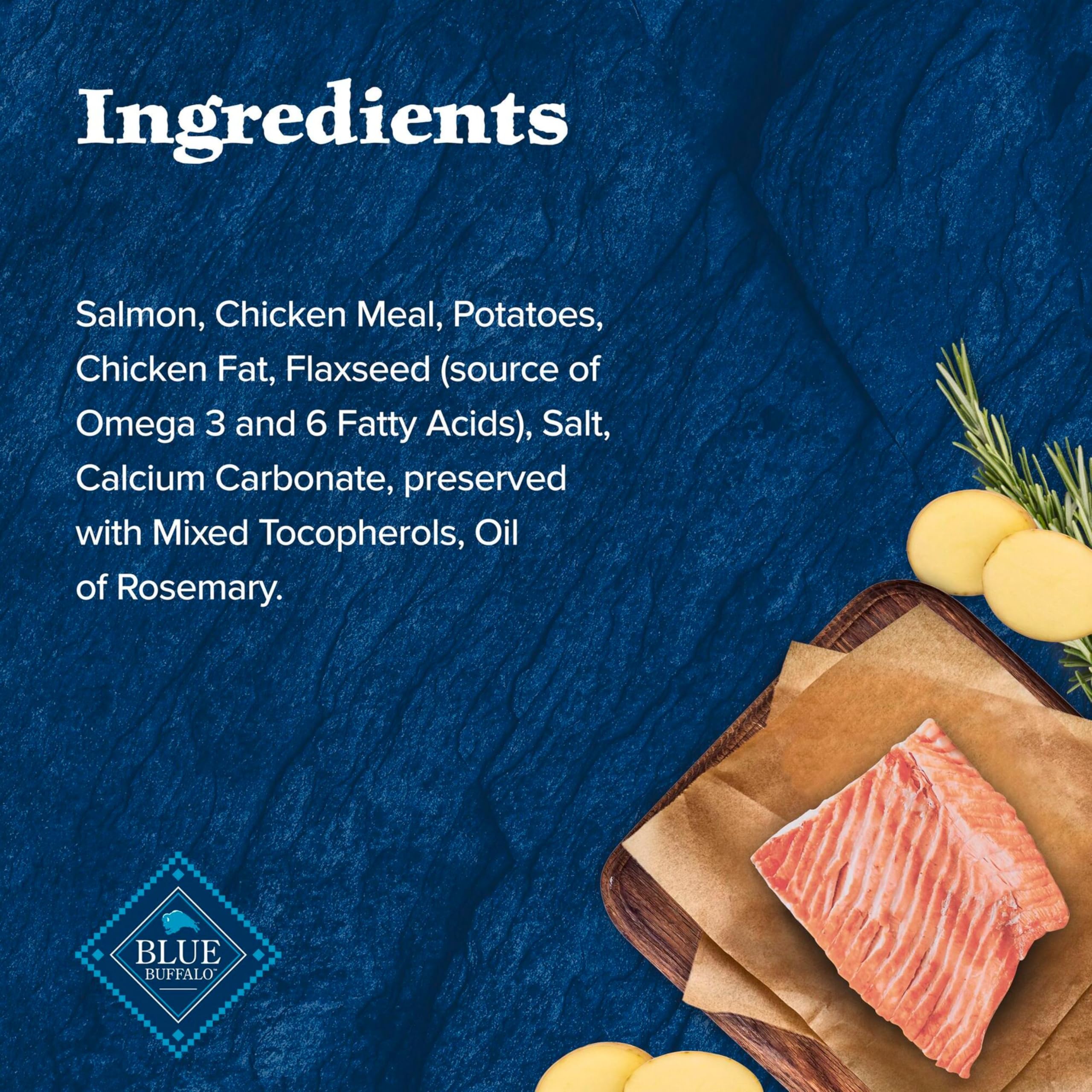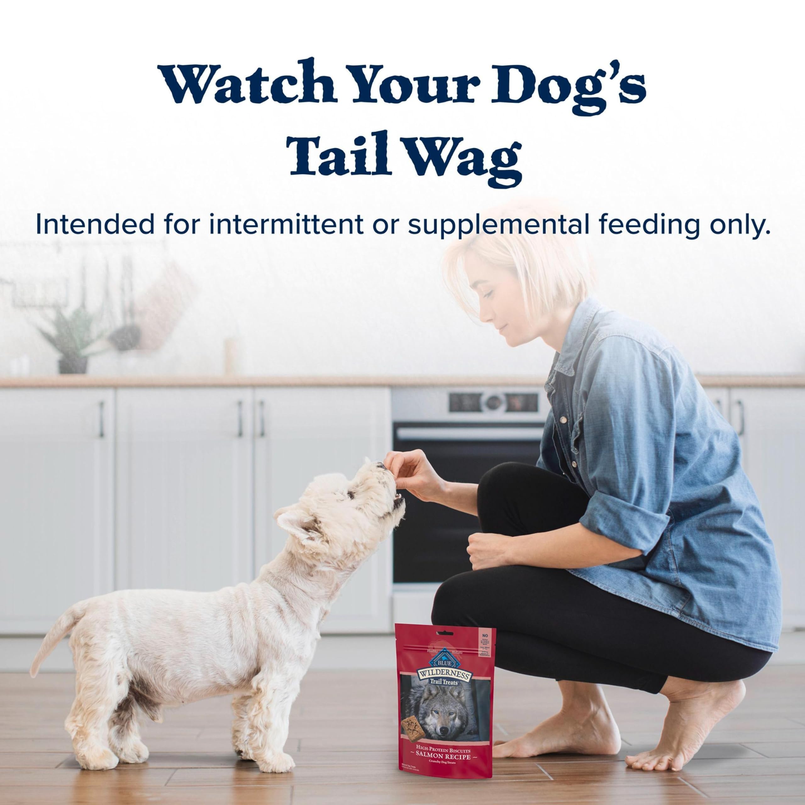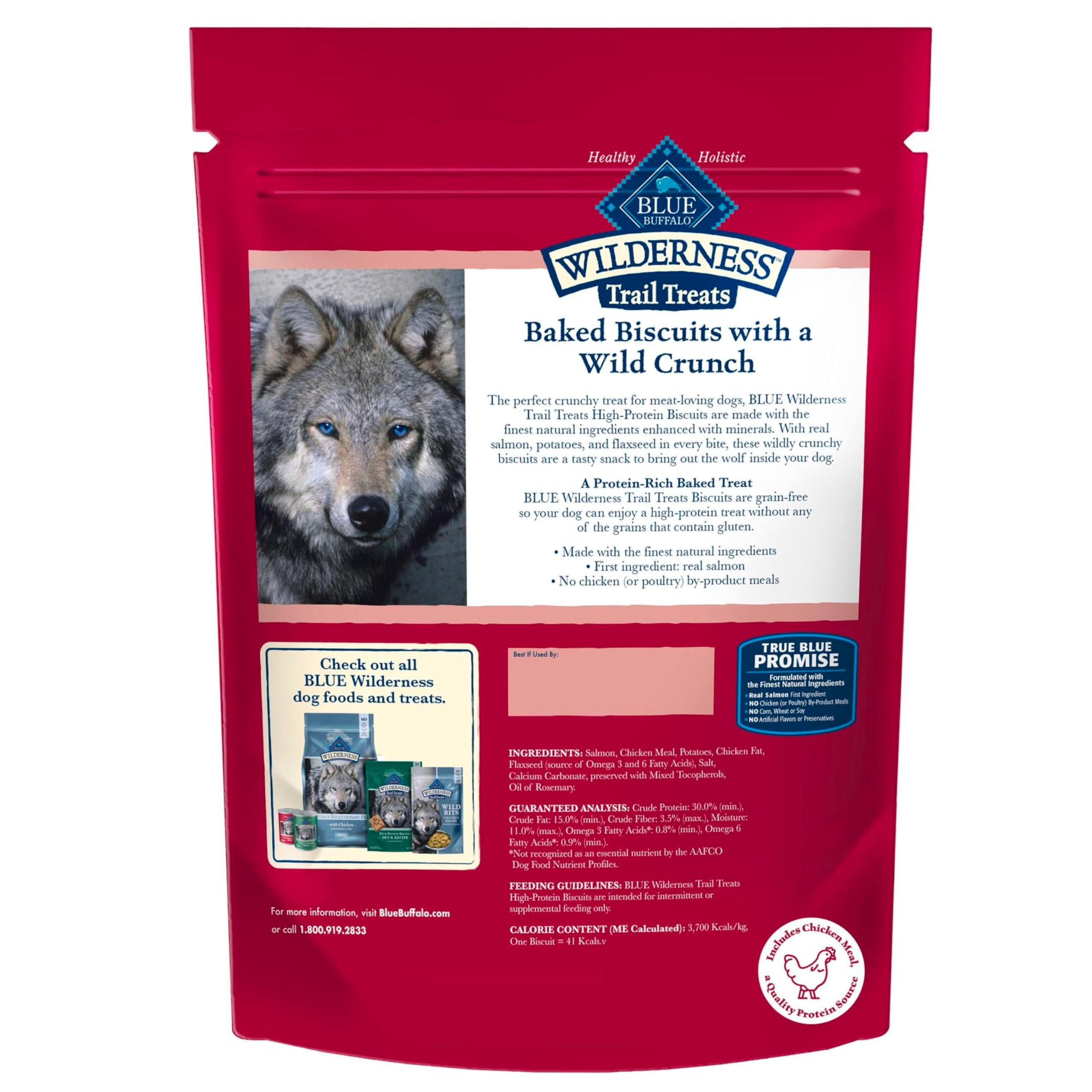 Product Description A perfectly crunchy dog treat for meat-loving dogs, BLUE Wilderness Trail Treats High-Protein Crunchy Dog Biscuits feature real salmon as the first ingredient. These High-Protein and grain-free dog treats are made with the finest natural ingredients. Bring out the wolf inside your dog with tasty salmon, potatoes, and flaxseed packed into every bite. Like all Blue Buffalo dog treats, these treats for dogs don't contain chicken (or poultry) by-product meals, corn, wheat, soy, artificial flavors, or preservatives. Watch your dog's tail wag when you reward them with BLUE Wilderness Trail Treats High-Protein Crunchy Dog Biscuits. From the Manufacturer Like all BLUE Wilderness foods, Wilderness Trail Treat Biscuits are 100% grain-free so your dog can enjoy a high-protein treat without any of the grains that contain gluten. Made with the finest natural ingredients. Always starts with real salmon. No chicken or poultry by-product meals