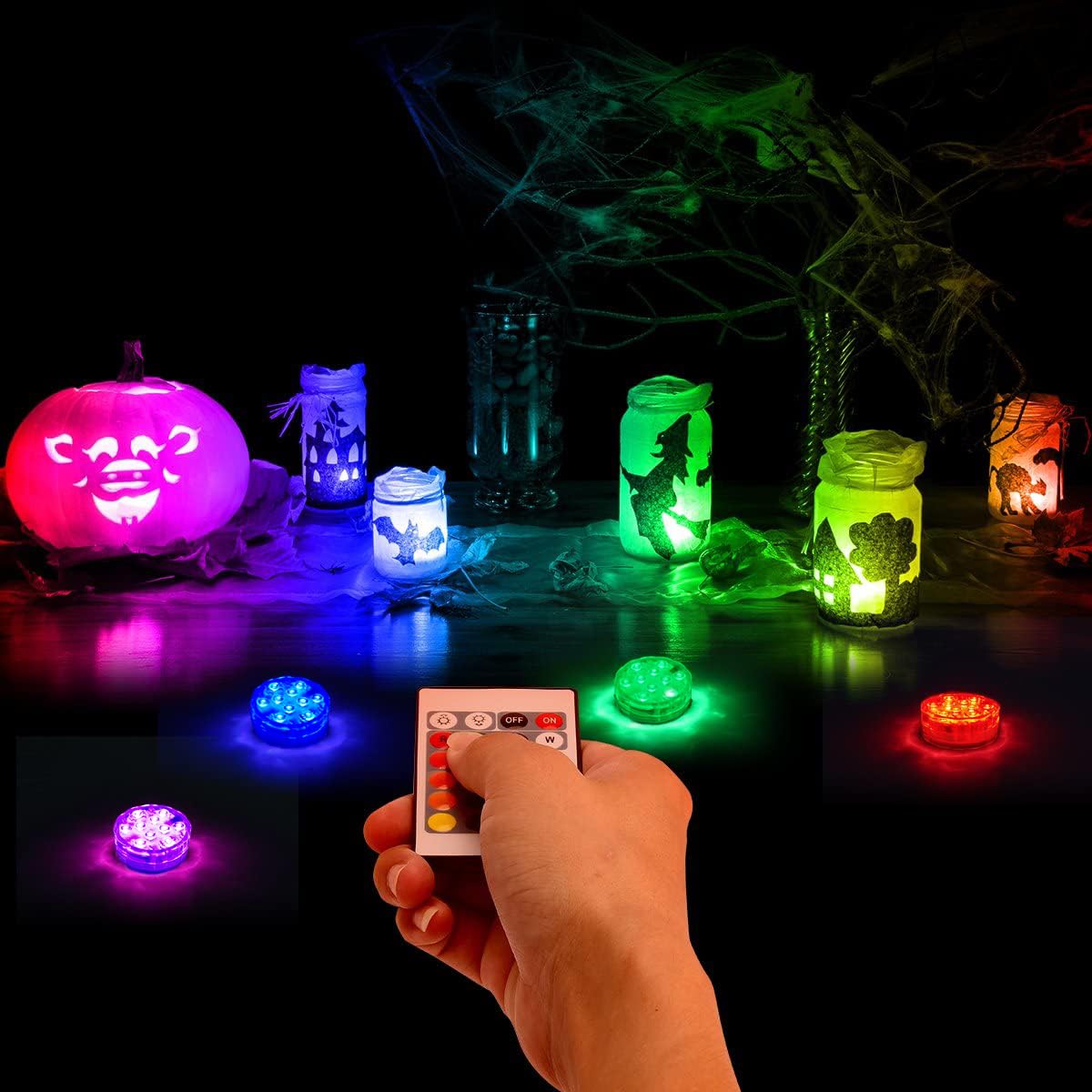 The submersible led lights Used for parties, event lighting, indoor and outdoor, flower design, event design, Halloween, Christmas, museums, shops, aquarium lights, household bulbs, etc. Product specifications Product size: 70*70*28mm Light battery: 3 x AAA batteries (not included) Light effect color: RGB (16 colors) Operating voltage: 4.5V Use power: 2W Waterproof rating: IP68 LED light source: 10 SMD LED diodes Infrared remote control battery: CR2025 button battery (included) Note: 1. There is a rubber O-ring at the bottom to prevent water from entering the inside. Therefore, tighten the cap (turn clockwise) until it can no longer be screwed into the water. If the cap is not in the absolute tightest position, water will quickly erode the light. 2. Lighting for special occasions only. After the event, please take it out of the water. Do not leave it underwater for more than 10 hours. 3. The battery can be used continuously for more than 24 hours (the operation mode may be different for different results). When the battery is exhausted, the indicator light will remain red. If you no longer switch between colors and the remote control cannot be controlled, you only need to replace the battery to solve the problem.