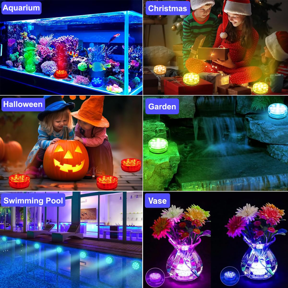 ✅【Multi-purpose】:Waterproof Pool Lights can use for Party/event illumination, holiday accent lighting, Indoor and outdoor, home accent lighting, flower design, transparent cover, event design. And also suitable for wedding, party, stage, Halloween, Christmas, disco, shopping mall, jewelry store, showroom, showcase, core, cabinet, museum, shop, aquarium light, aquarium light, home bulb, etc.