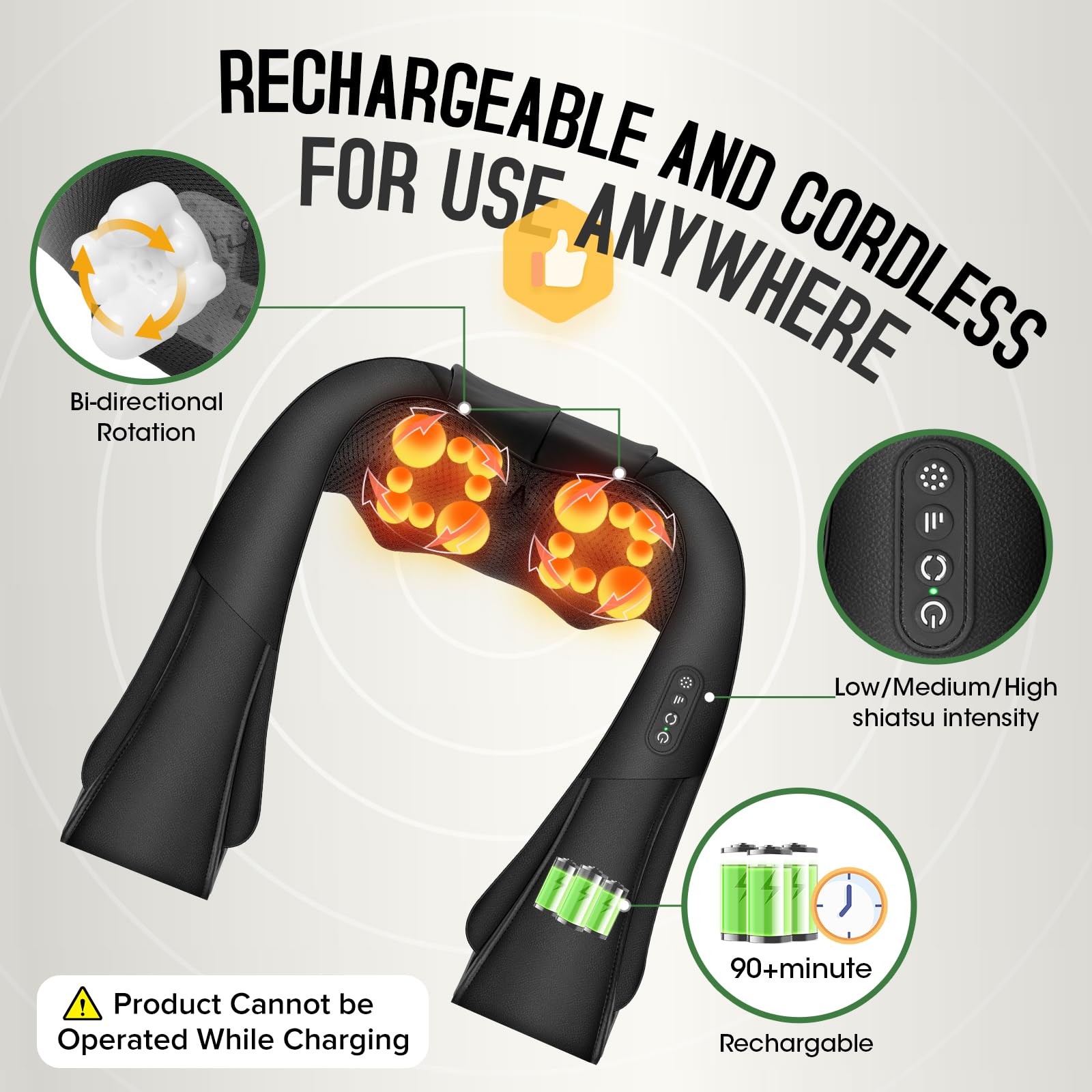 Heating Function:Built-in heating function enhances the massage experience and makes you feel more comfortable. Lightweight and portable, this neck and shoulder massager is comfortable even when worn for a long time, making it ideal for home, office, car and travel. It comes with a type-c charging cable for your convenience