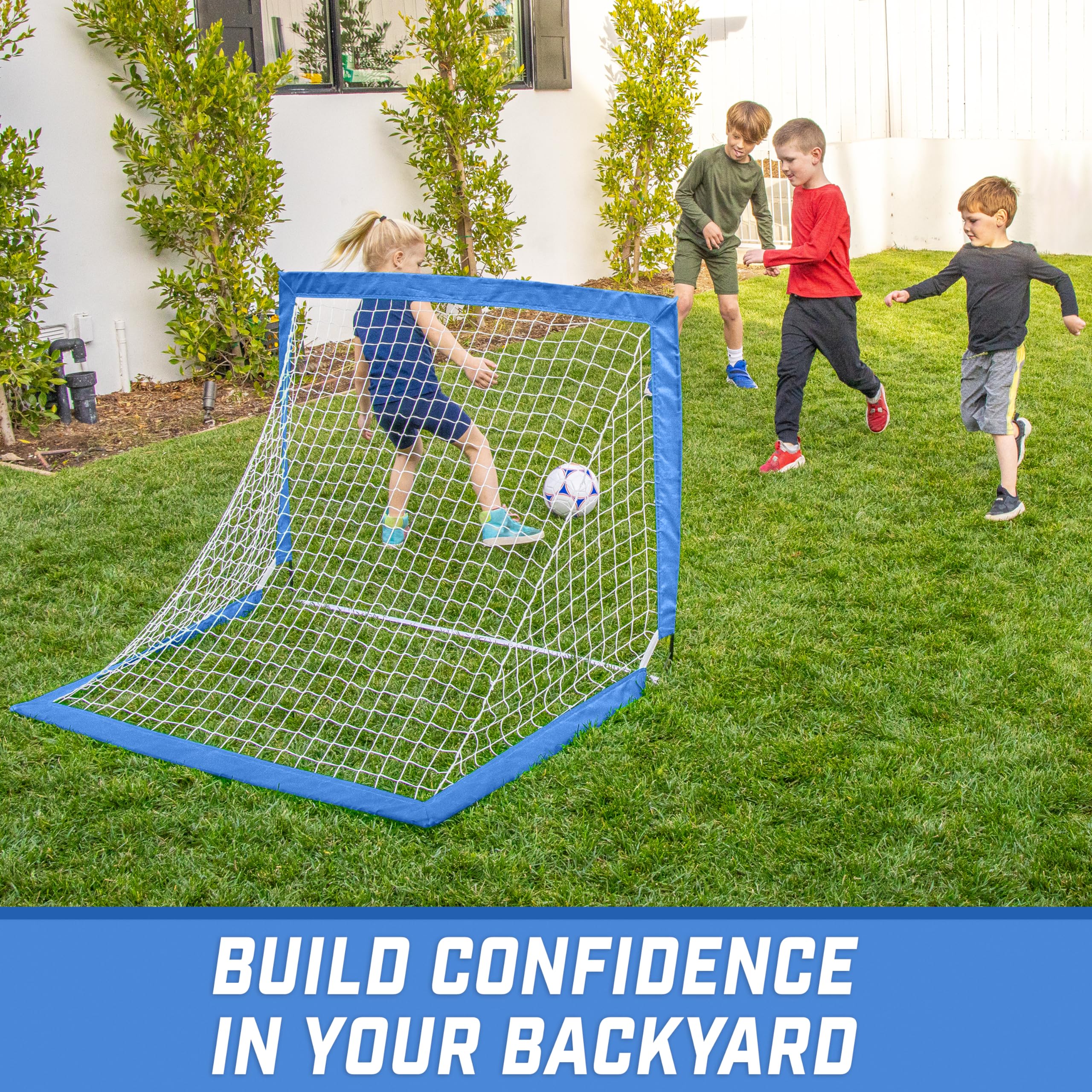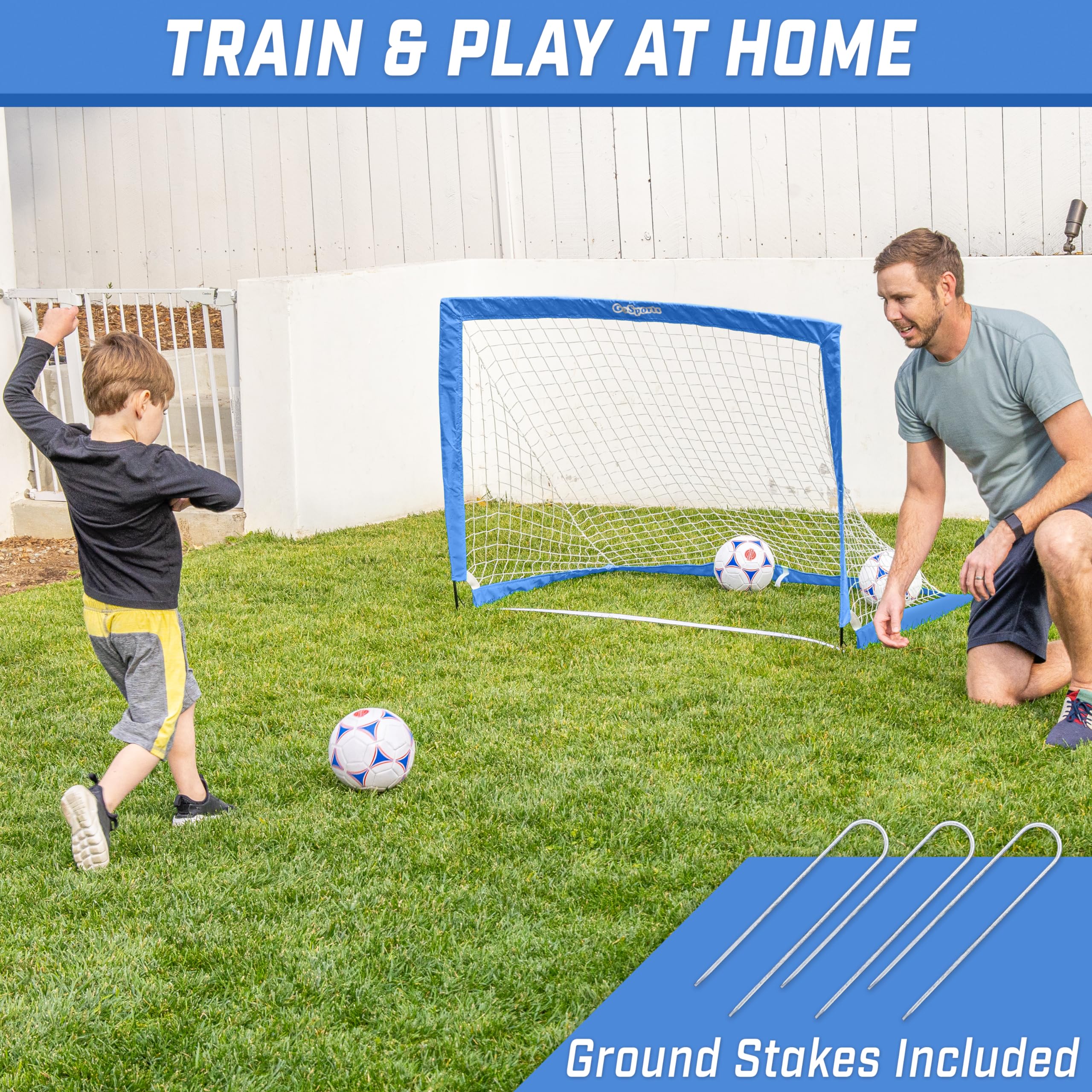 TRAIN AND PLAY: Build confidence in the backyard or use the goals on gameday; Includes 1 pop-up 4 ft x 3 ft soccer goal net and 3 metal stakes for stability; Perfectly sized for kids and youth sports, and great for budding soccer players