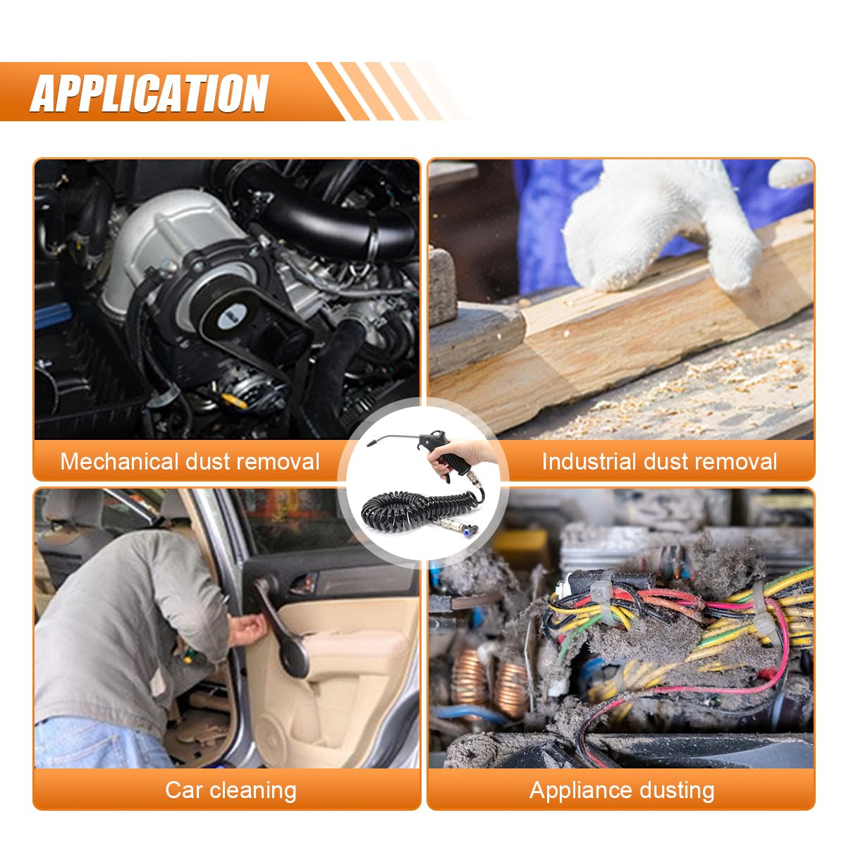 【Long Nozzle Design】: Featuring a steel nozzle, this air duster gun delivers optimal airflow and powerful pressure, making it easy to clean hard-to-reach areas like under truck seats and inside machinery.