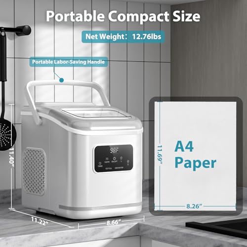Portable copmact mini size ice maker machine: This countertop ice maker weighs 14.08 pounds with handle. The small ice maker measures D11.57*W8.74*H11.42 inches. This' mini portable ice maker is perfect for homes,offices,camping, and parties