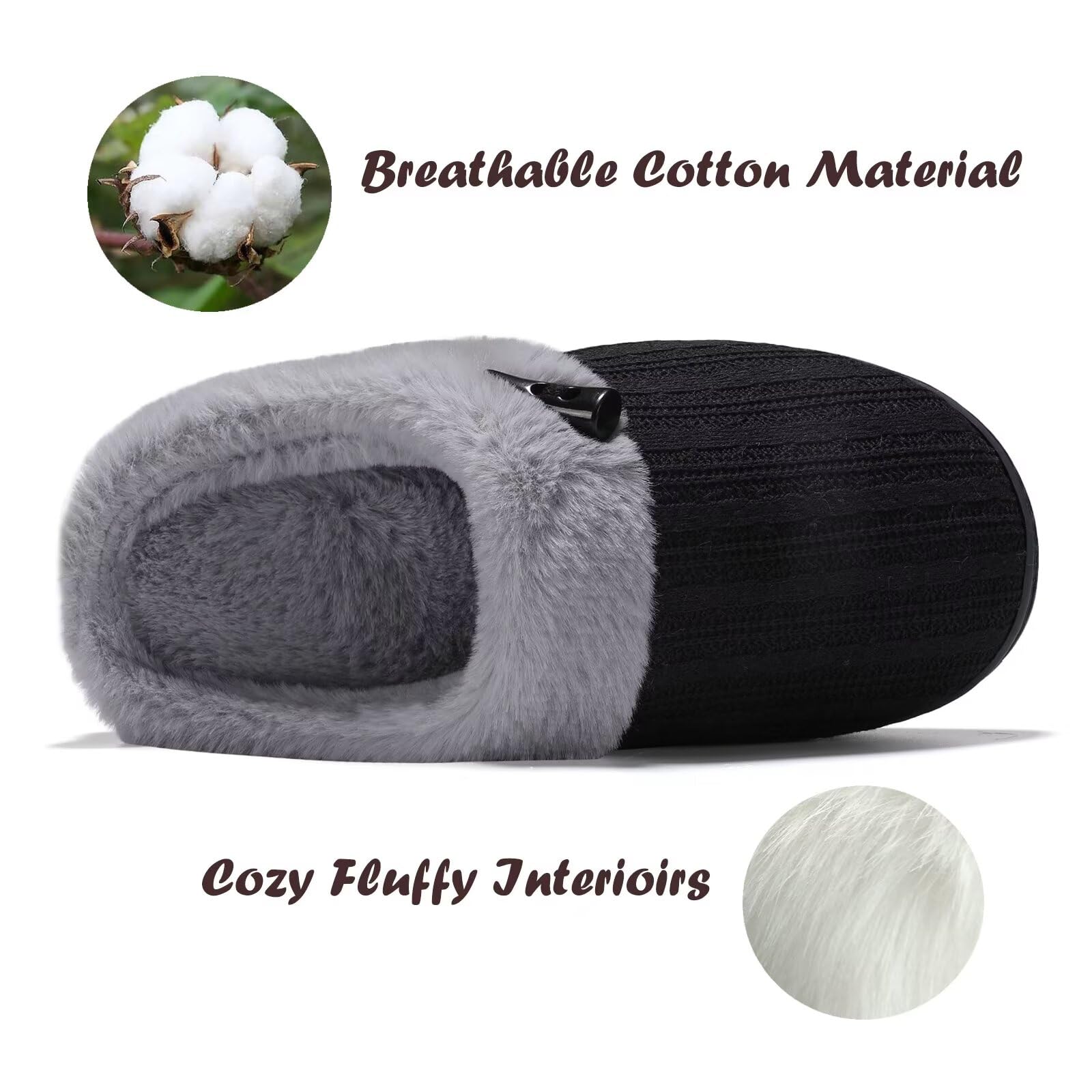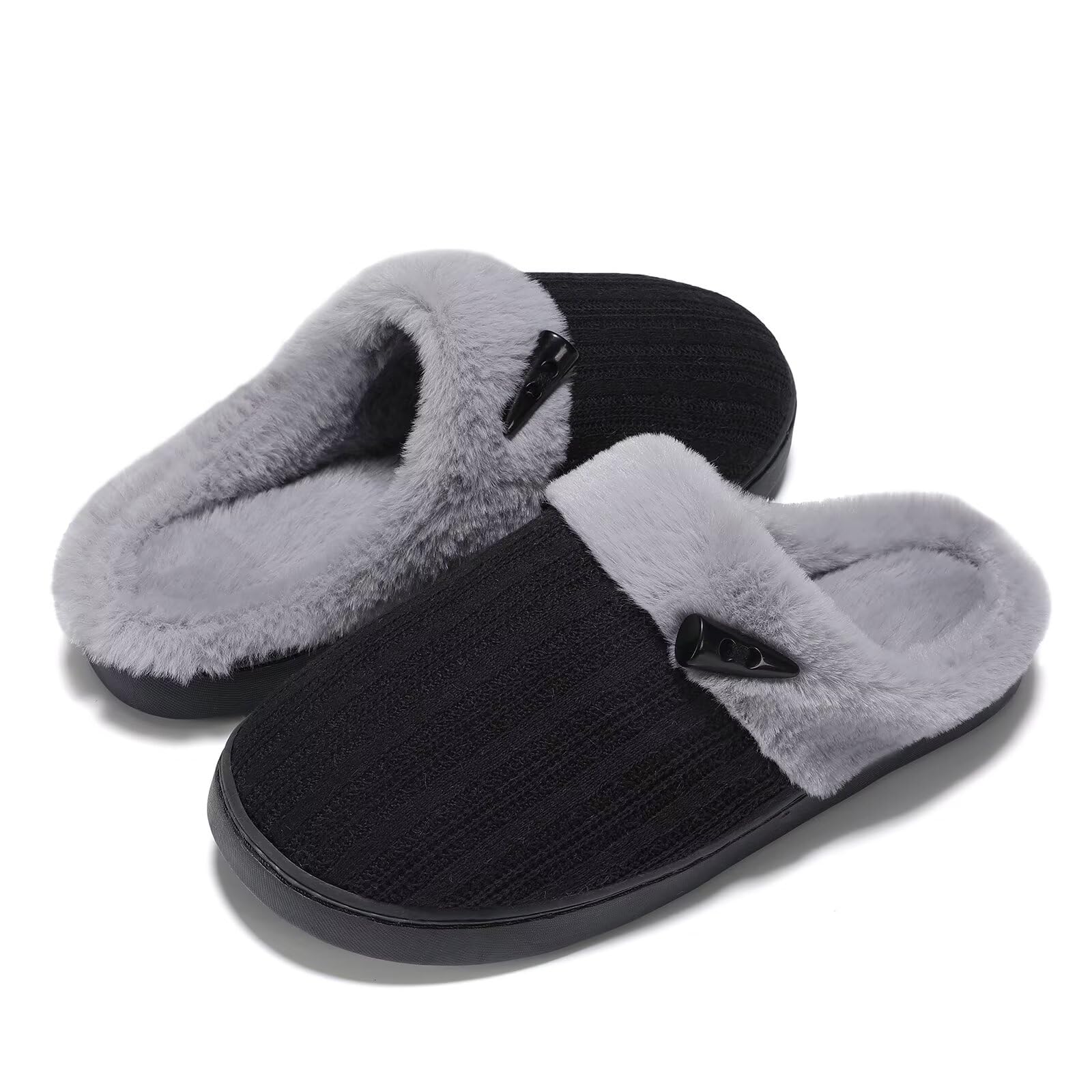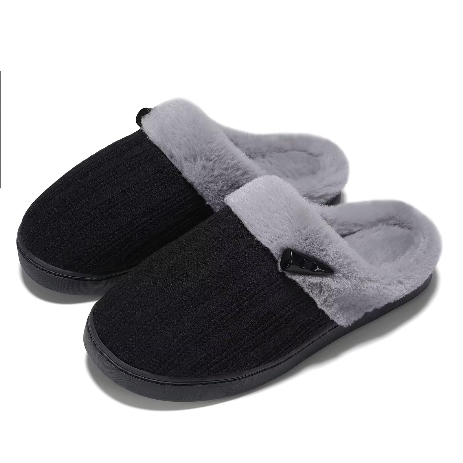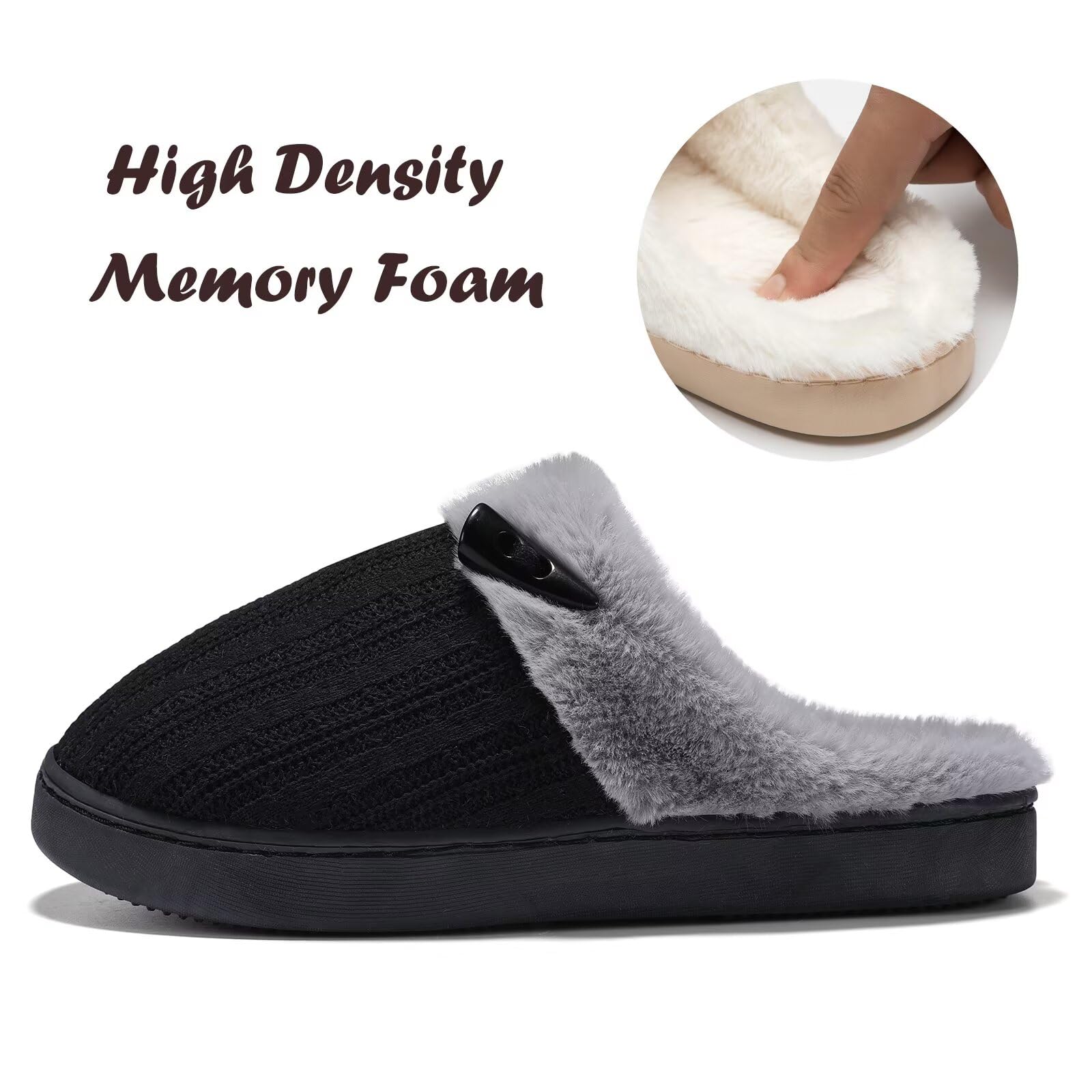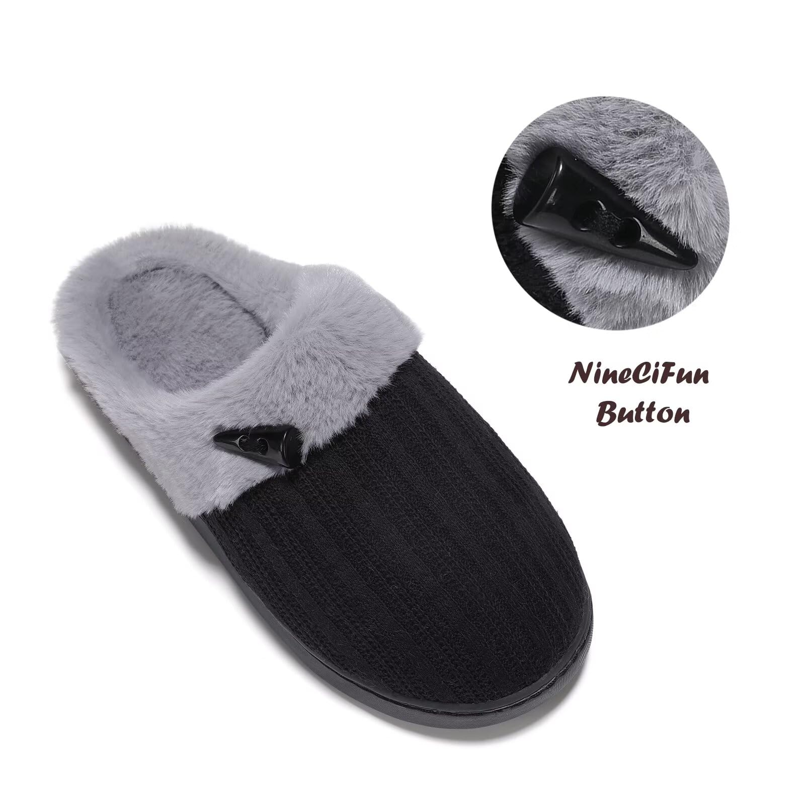 EASY SLIP ON STYLE:Step into comfort easily with these open back fuzzy bedroom slippers that are made with fluffy plush.Soft plush faux fur lining offers superior comfortability from the clouds.Also these comfy house shoes are so chic with knitting upper and horn button design