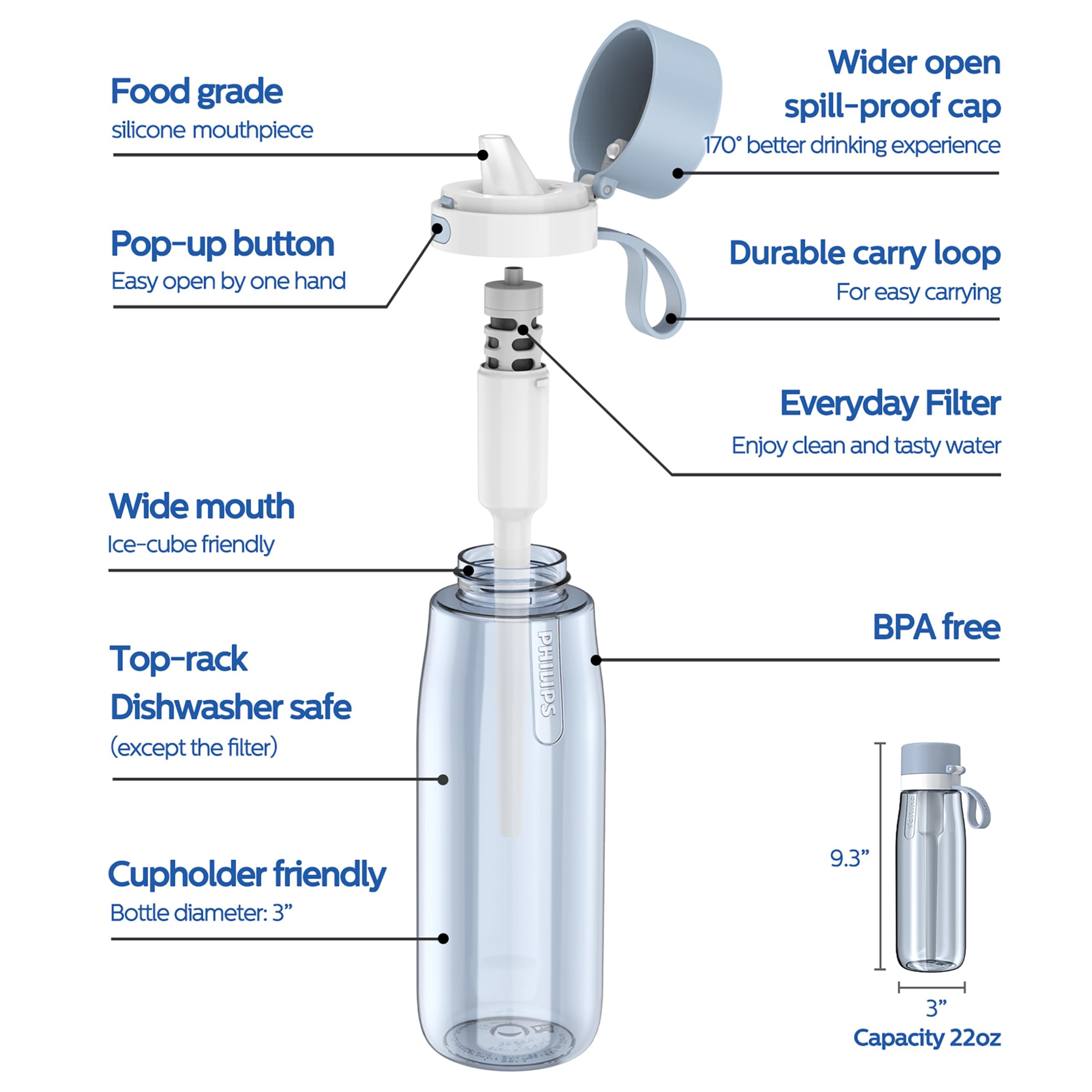 𝗛𝗲𝗮𝗹𝘁𝗵-𝗙𝗶𝗿𝘀𝘁 𝗕𝗣𝗔 𝗙𝗿𝗲𝗲: Made of BPA-free Tritan plastic, this straw bottle is designed to work with the Philips GoZero Everyday Filter. The silicone mouthpiece lets you easily sip water without compromising the flow of water. (*Activated carbon water filters generally DO NOT reduce minerals or TDS)