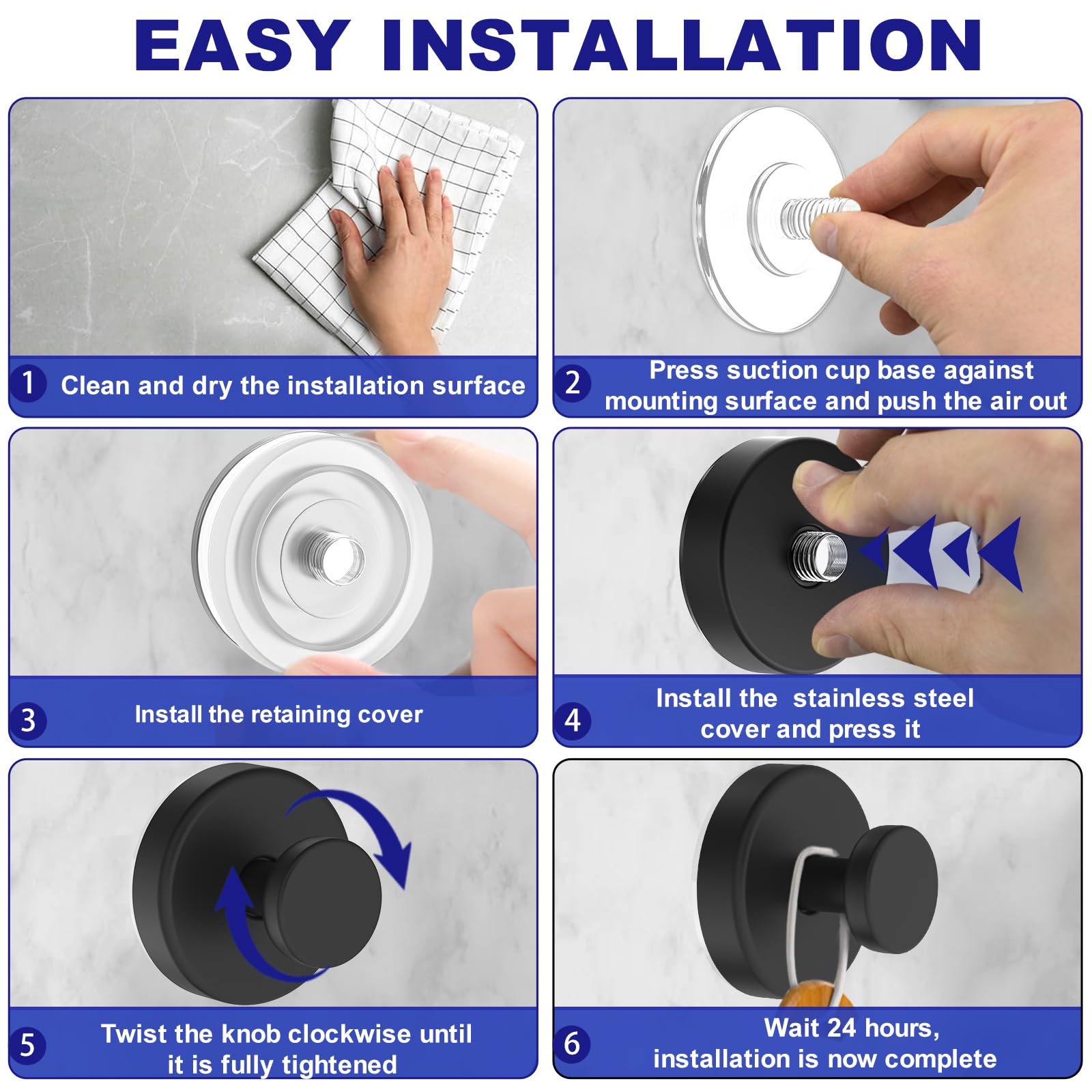 [Effortless Setup in 3 Steps]: 1. Clean & Dry a smooth, non-porous surface; 2. Loosen the hook counter-clockwise, take out the suction cup base; 3. Press the base against the surface and twist the knob clockwise until fully tight. Watch our video for detailed instructions.