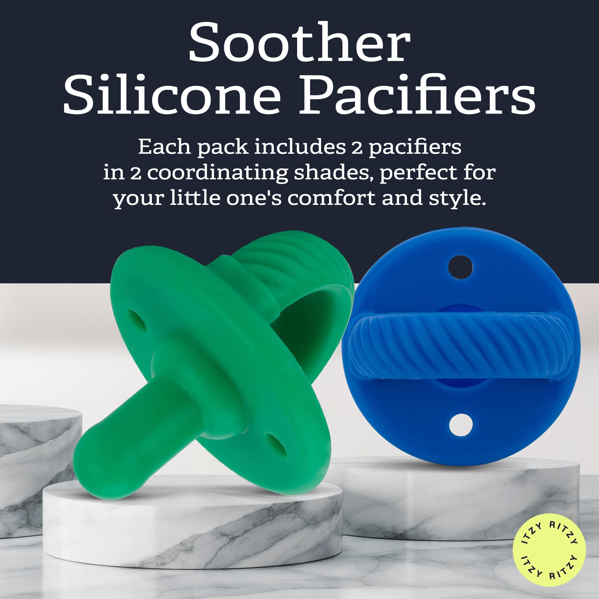 Discover Itzy Ritzy's 100% food grade silicone pacifiers, an excellent choice for your baby's comfort and safety. Crafted with premium silicone and certified to meet strict ASTM standards, this 2-pack of pacifiers features a soft and durable nipple shape ideal for newborns. The adorable cable detail on the collapsible handle adds a touch of style to your baby's outfits, and the two airholes ensure your little one's safety. Make Itzy Ritzy pacifiers a must-have in your newborn essentials, offering both comfort and peace of mind.