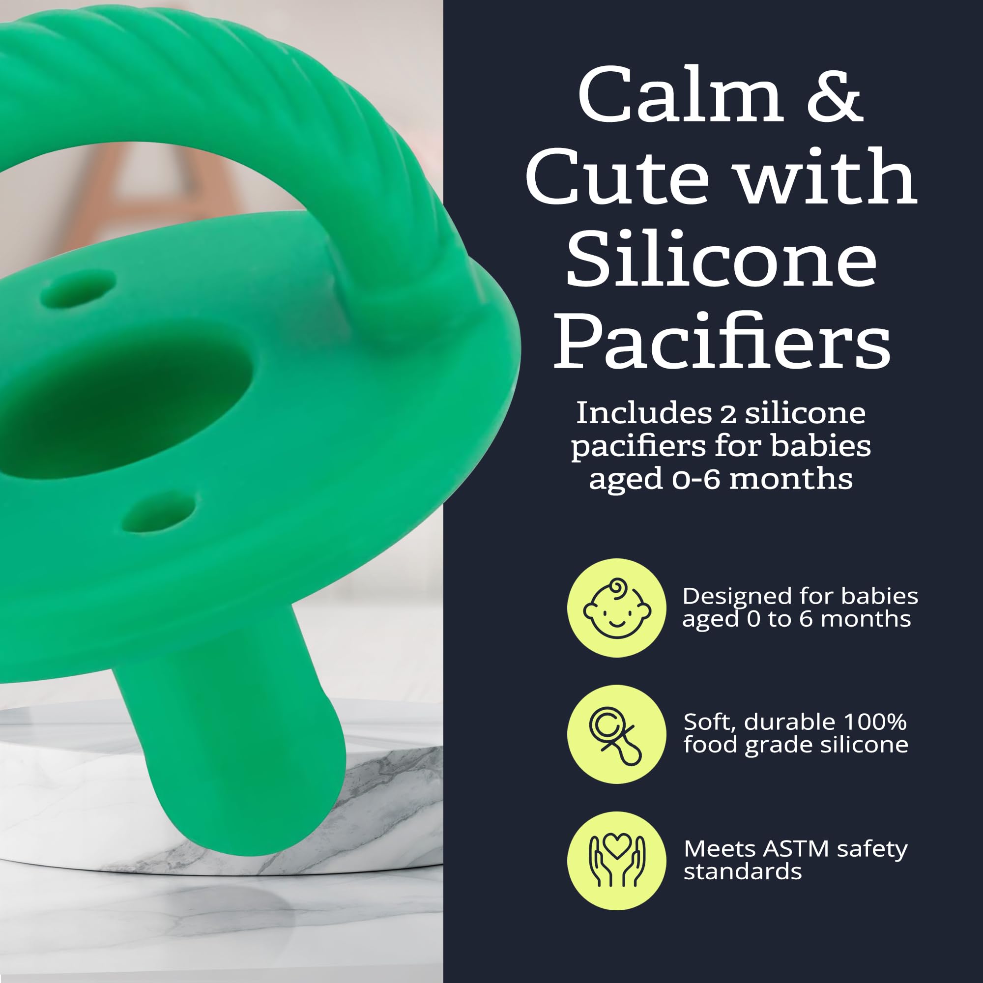 SAFETY TESTED AND CERTIFIED: Our pacifiers are tested to meet stringent ASTM safety standards. The single-part design, collapsible handle and two large vent holes prioritize your baby's safety. Our pacifiers are also PVC and BPA-fee for a worry-free experience.