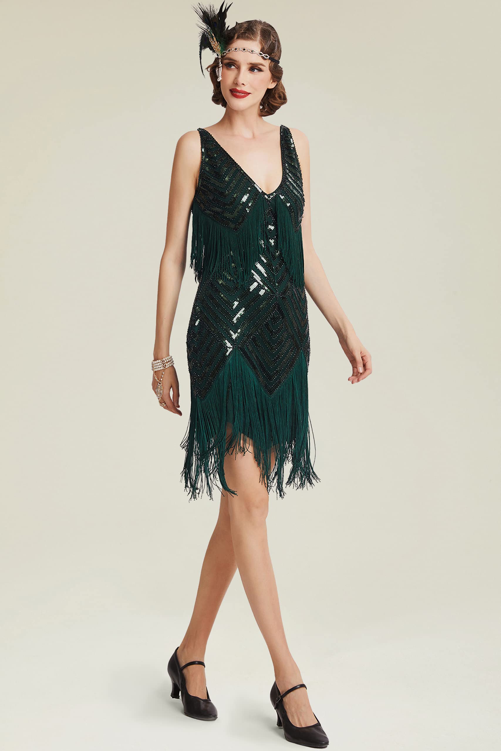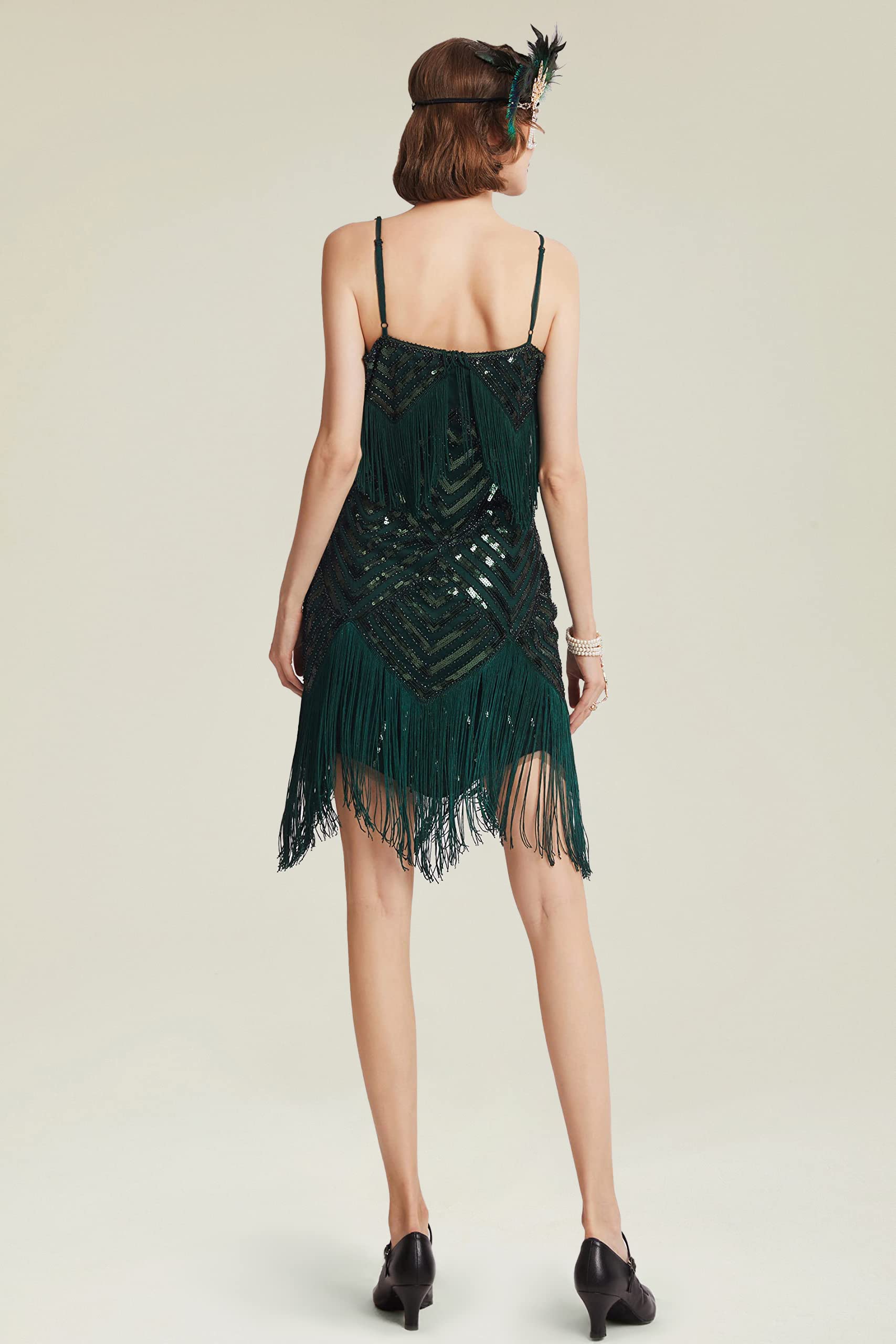 Design: Classic 1920s striped design with sequins and beads accents for a charming pattern. The chest line and bottom hem are trimmed with long tassels to flatter the sexy and glamorous body line.