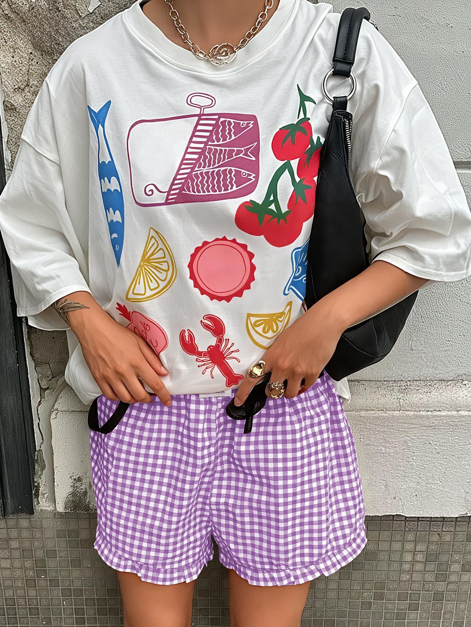 Material - 100% Rayon. Stretch - Non, Thickness - Thin, Softness - Medium. Machine wash cold gently with like colors. Do not bleach.Ironing temperature should not exceed 110°C. Our stylish high-waisted gingham lounge Shorts for spring summer and autumn! Featuring a plaid and stretchy waistband, pair them with your favorite crop tops, sweaters, or tees to rock the perfect trendy girl look.