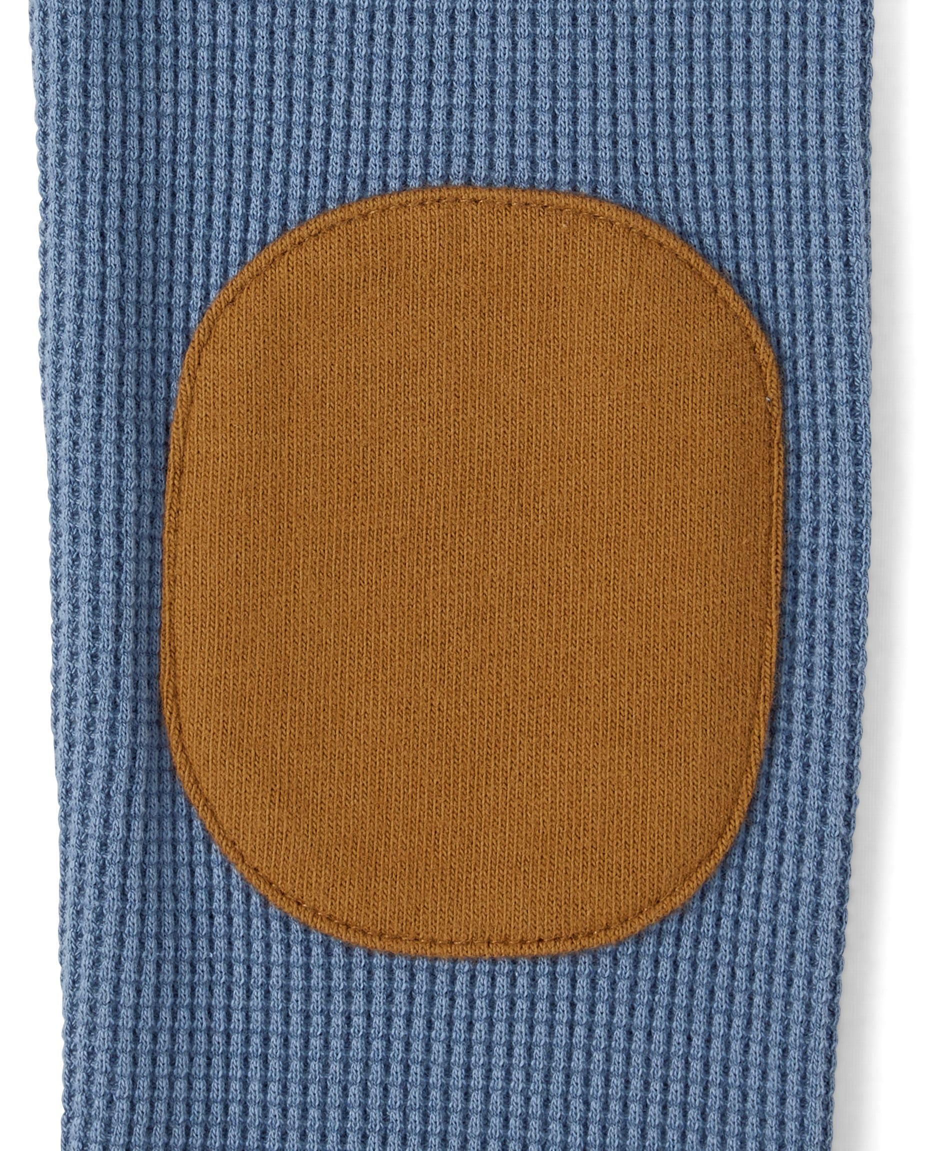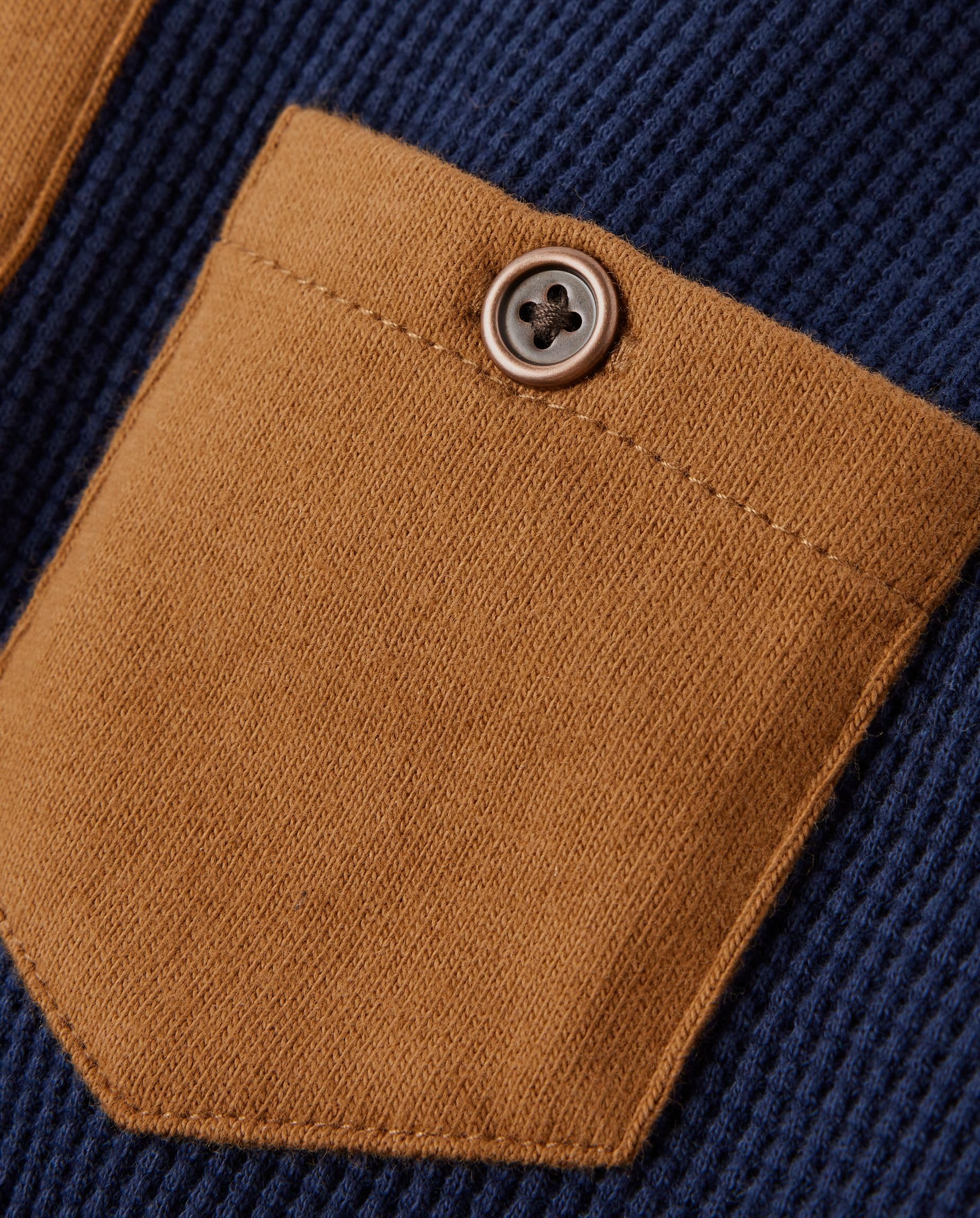 FABRICATION: 83% cotton/17% polyester waffle body, 100% rib-knit cotton neck & sleeve cuffs, 100% cotton jersey placket, pocket & elbow patches, imported
