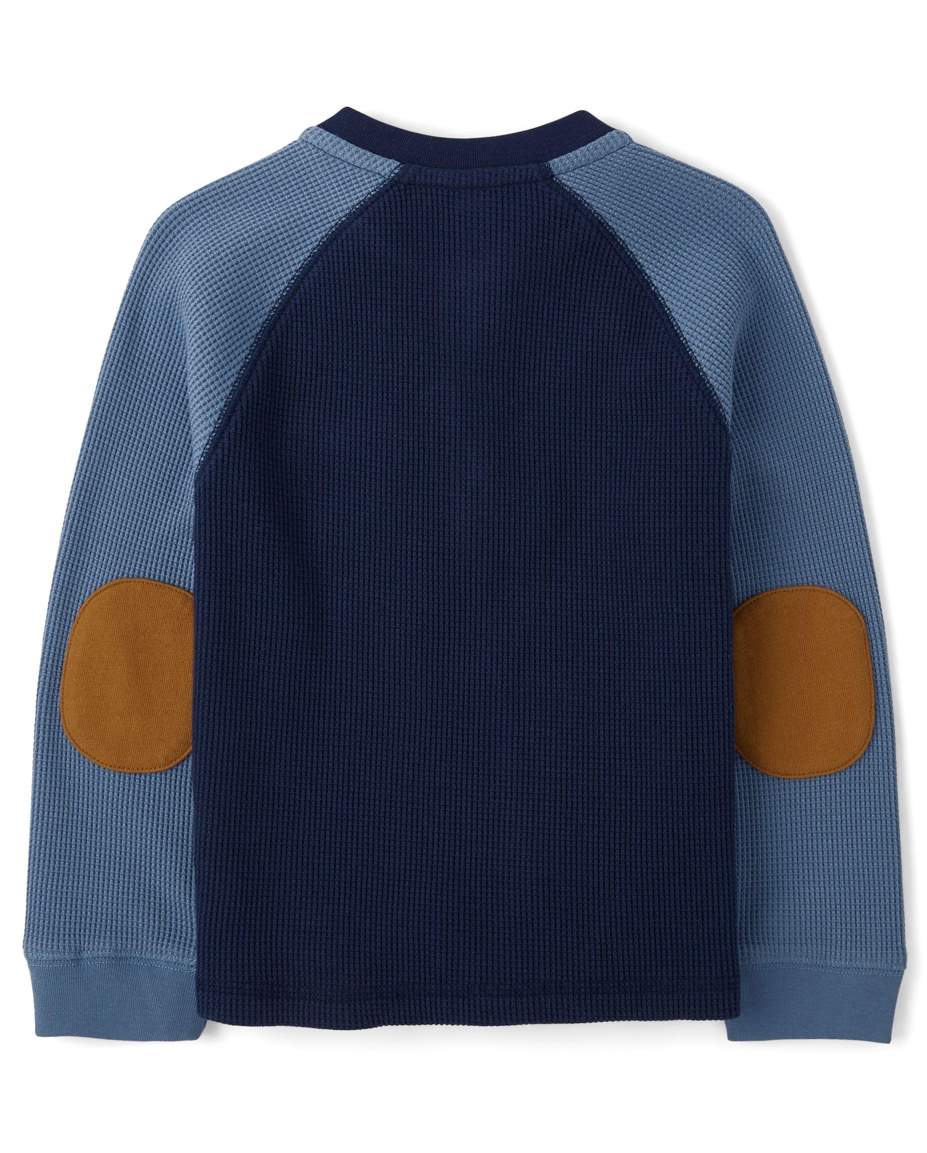 FIT & DESIGN: Rib-knit henley neck, long contrast raglan sleeves with elbow patches & rib-knit cuffs