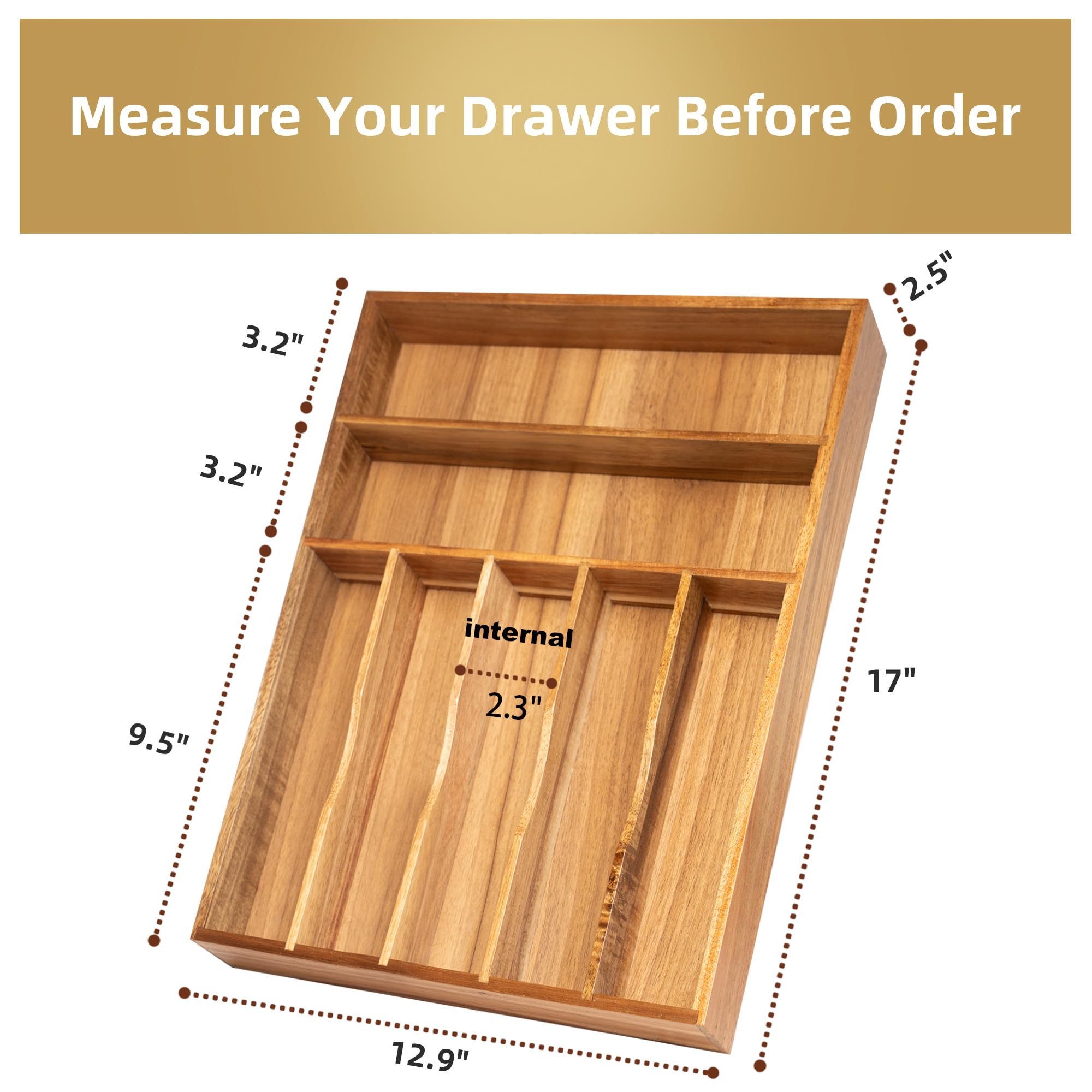 【Keep Your Home Tidy】This beautiful 7-compartments cutlery organizer has 2" deep compartments and can be placed into any drawer or desktop, which helps you to see everything at a glance and keep away from messy. The perfect space-saving acacia wood silverware organizer helps you to reach the desired item that you are looking for. Whether you are looking for your favorite knife or spoon, this utensil organizer makes it completely simple. We highly recommend to measure your drawer before order.