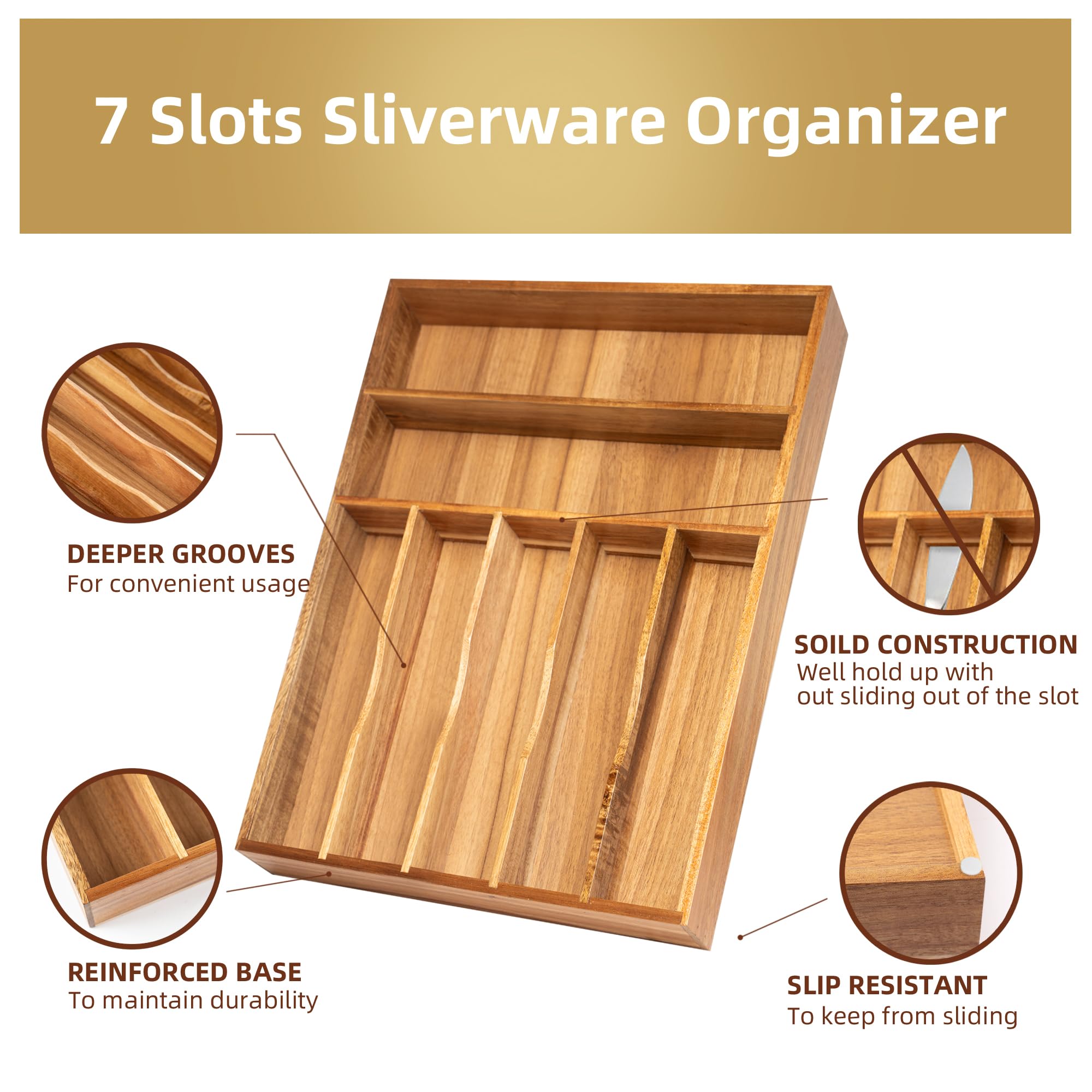 【Sturdy and Well-made】Our acacia wood silverware tray for drawer is made of natural acacia with the age of over 4 years, which makes the silverware holder durable enough for long time use. Even the knife won't leave scratch on it. Unlike the plastic and metal drawer organizer, our silverware tray more classic and natural, the color and texture of the kitchen drawer organizer is 100% natural and even.