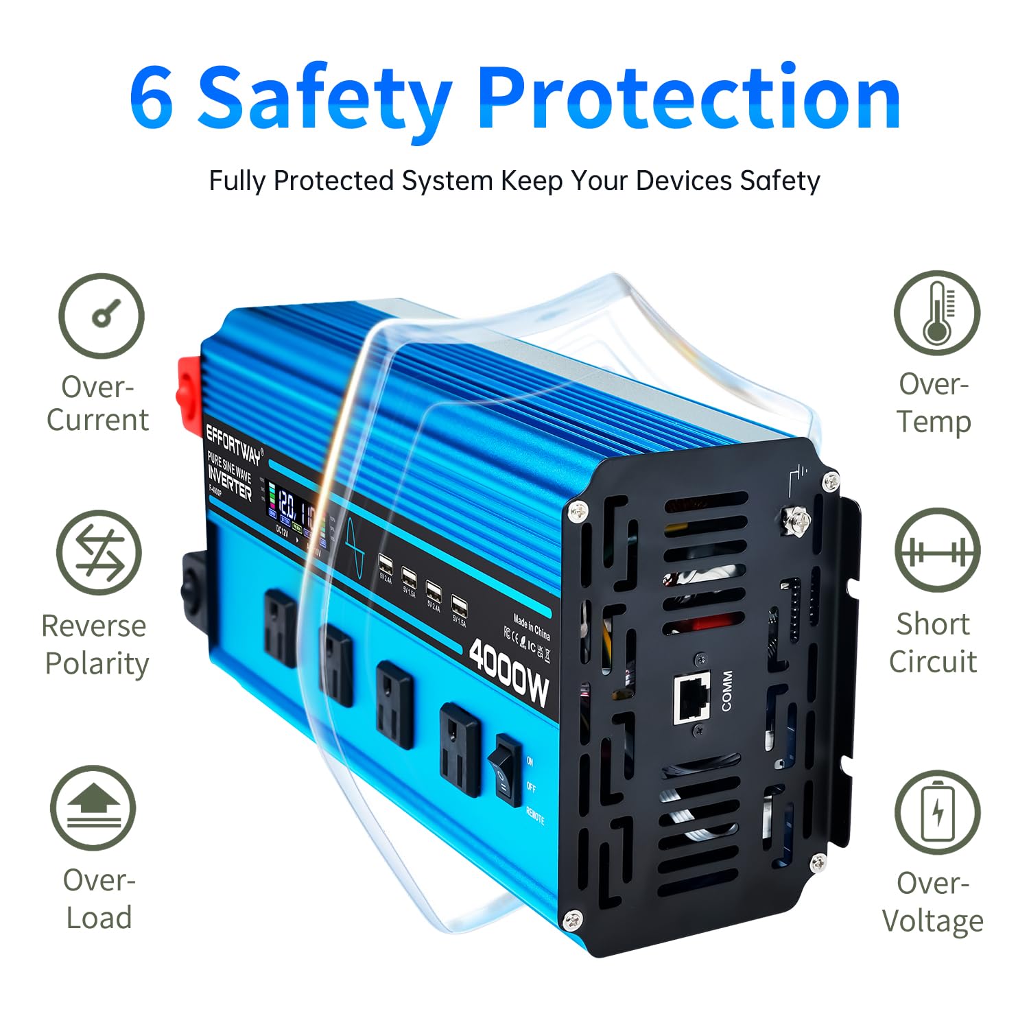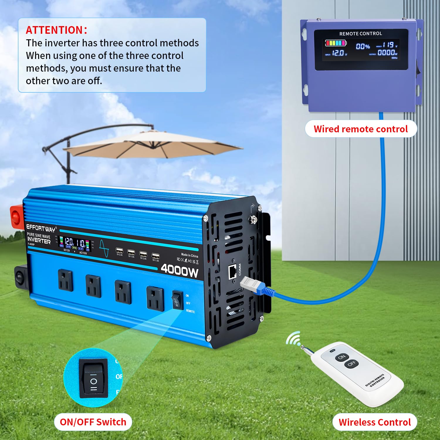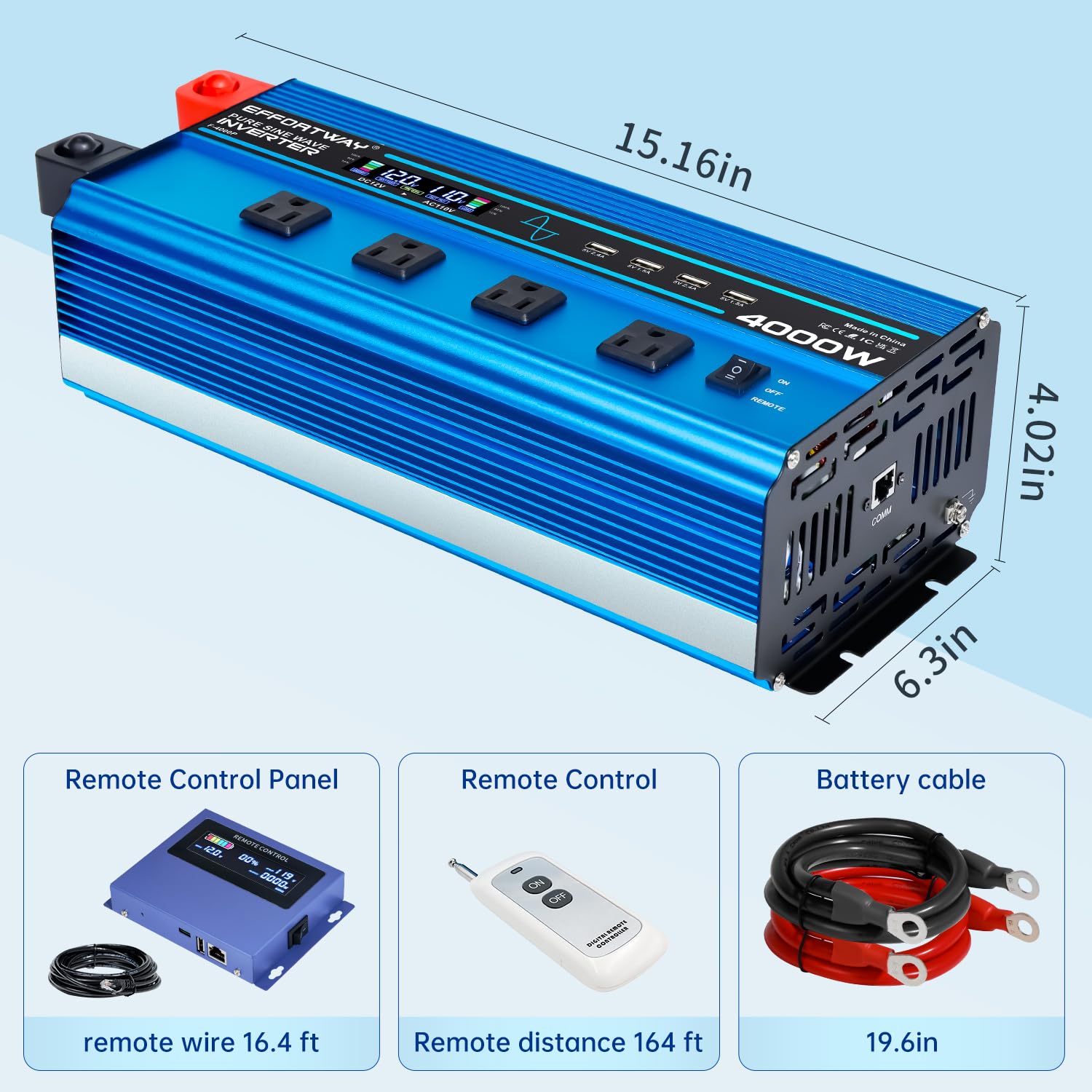 4000W Pure Sine Wave Inverter: Provides stable 4000W continuous power and 8000W peak power to easily convert power from DC 12V to AC 110V/120V 60HZ. with more efficient conversion rate (>90%) to ensure reliable performance for outdoor adventures, camping and trucking use