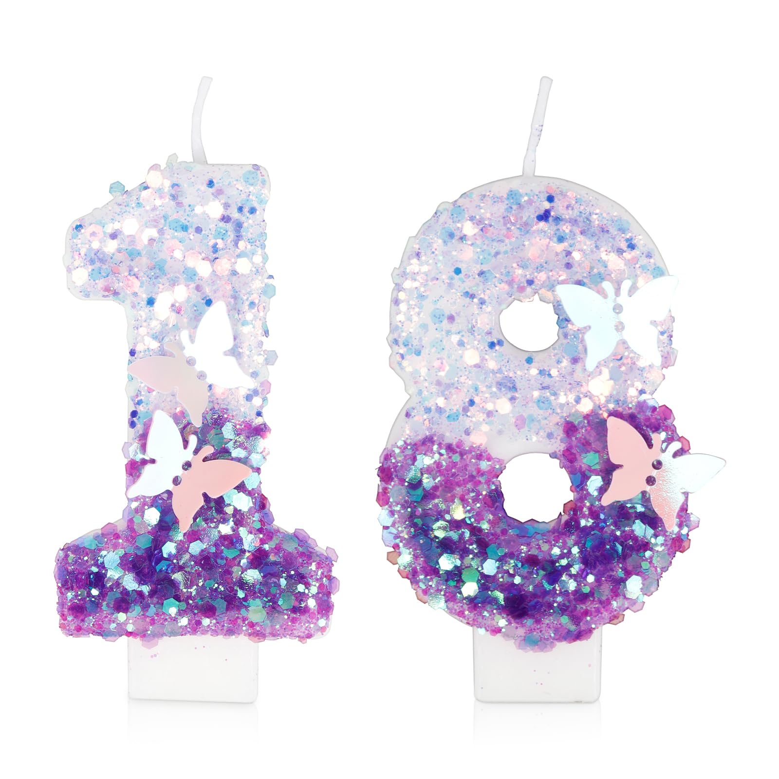 Birthday Candles, Number 18 Candle, Butterfly 18th Birthday Decorations for Women/Girl, Purple Happy Birthday Candle for Cake, Handmade Sequin Numeral Candle Wedding Cake Topper Anniversary Party Decor Features: Delicate appearance: The happy birthday cake candles are meaningful for you to celebrate your birthday and nice cake topper decoration for embellishing your cake and cupcake,creating romantic atmosphere and adding a touch of elegant. Adapt to the venue: Ideal Purple party cake decoration for many occasions, such as birthdays, pet birthdays, baby showers, anniversaries, retirement parties, family reunions, weddings, Hawaiian parties, even Christmas, must-have items for party cake, bring you memorable and meaningful party. Specifications: Quantity: 2 piece Material: wax, plastic Candle length: approx. 5 cm/ 1.97 inch Total length: approx. 11.5 cm/ 4.5 inch Color: as pictures shown Package includes: 1 x Butterfly Number 1 Candles 1 x Butterfly Number 8 Candles