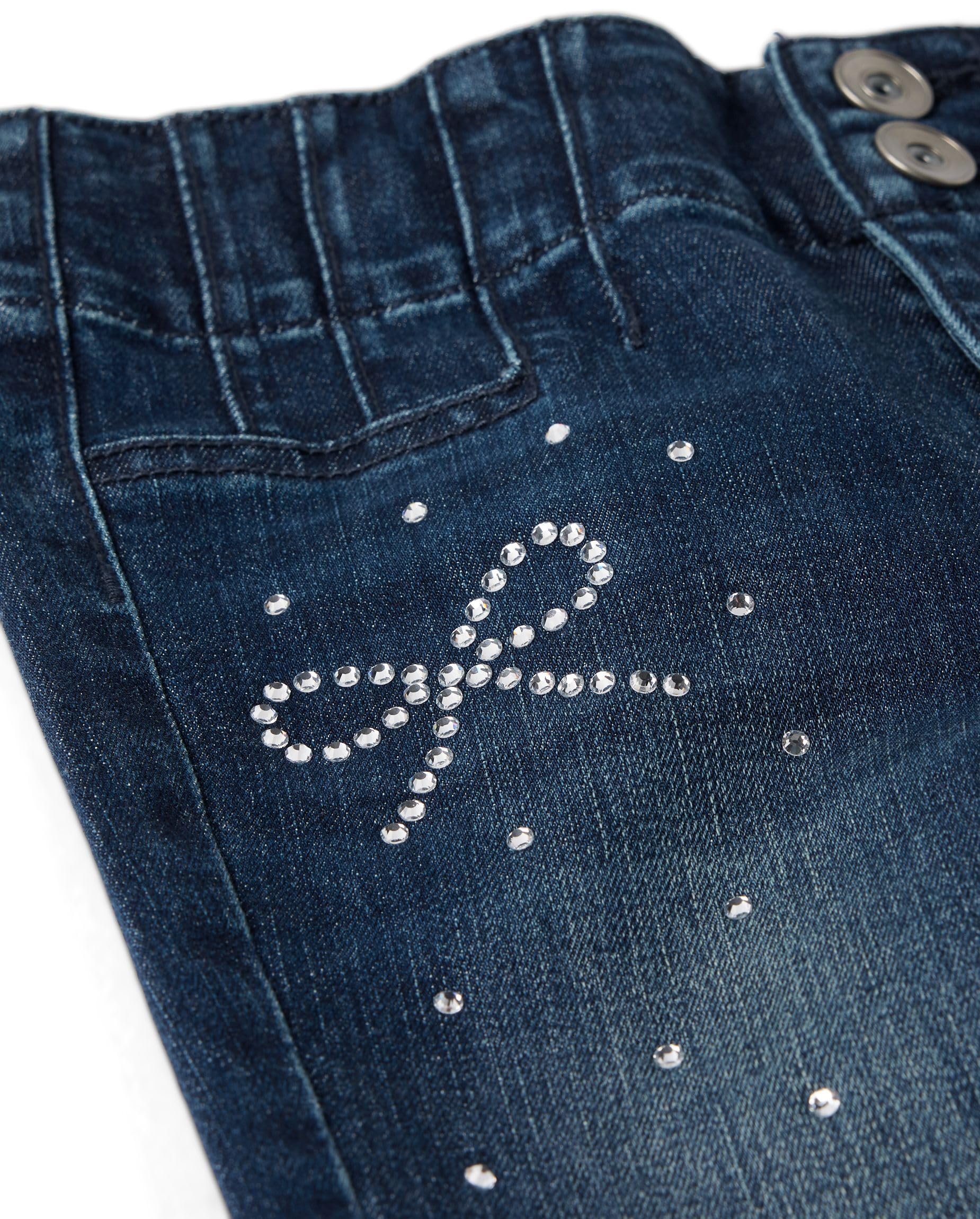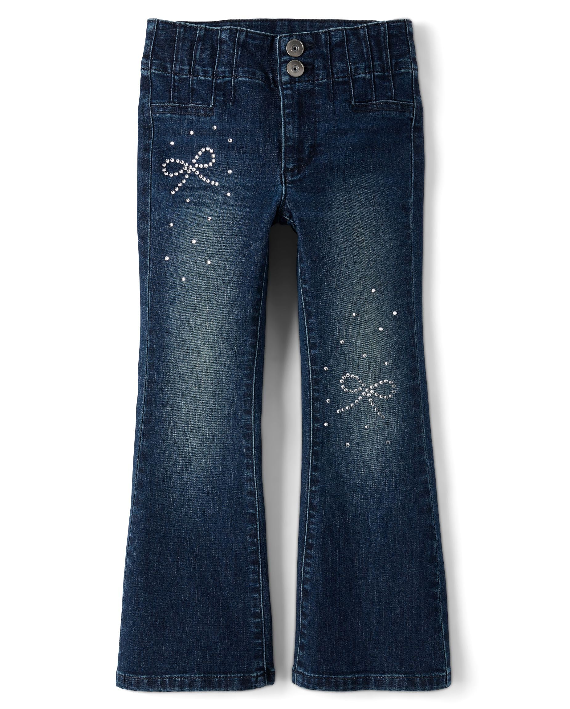 FEATURES: Front patch pockets, pleats at front & back, handsanding, whiskering & rhinestone bows at front, pre-washed for added softness and to reduce shrinkage
