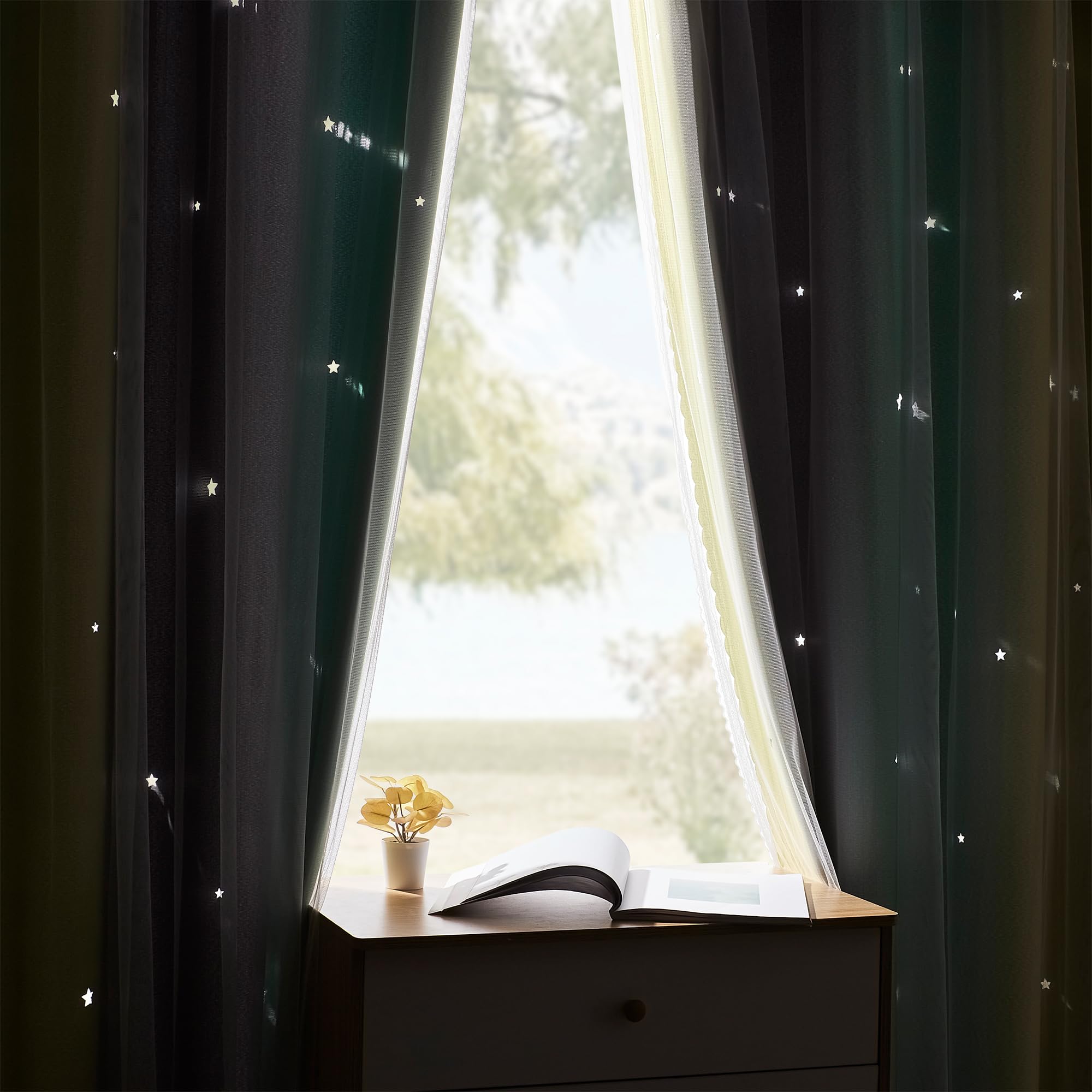Transform your space with our enchanting double-layer curtain set, crafted with a dreamy combination of delicate sheer fabric and premium blackout curtains featuring laser-cut star patterns. Designed to balance functionality and style, the thick light-blocking layer ensures complete darkness for restful sleep or home theater nights, while the whimsical star cutouts filter sunlight into a soft, twinkling glow that dances across your floors like celestial art. Perfect for bedrooms, nurseries, or living areas, these noise-reducing curtains add magical charm to any room with their constellation-inspired design—watch morning light transform your walls into a starry wonderland!