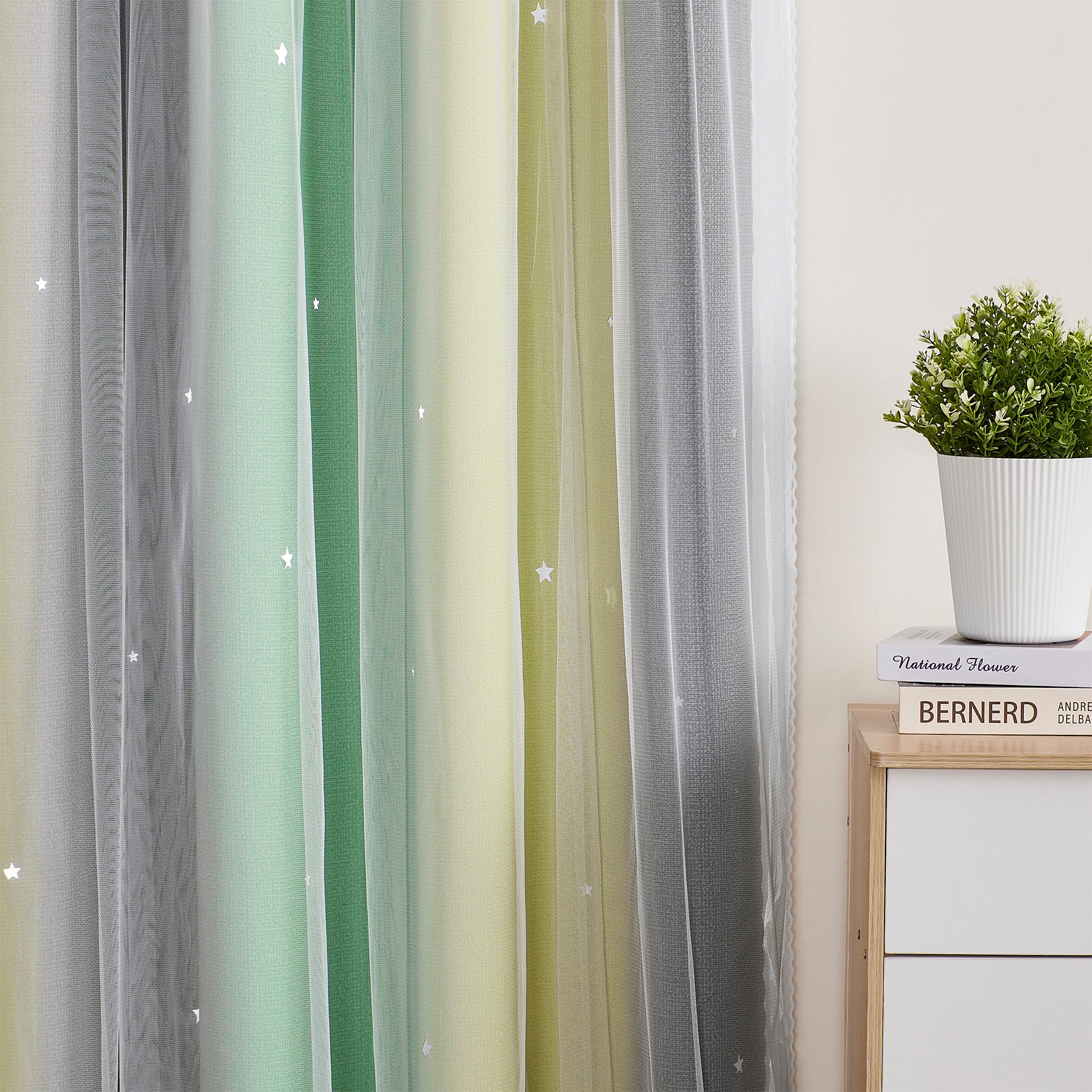 UNIQUE DESIGN: The curtains have a two-layer integrated design, with a sheer layer adding cuteness and fashion. The sheer fabric's lightweight and transparency create a romantic and hazy atmosphere. On the printed blackout curtains, there are hollow star patterns that twinkle like stars when light passes through, creating a dreamy room. The blackout curtains also feature a digital print in three colors that blend gradually, with coordinated color combinations to enhance the decorative effect.