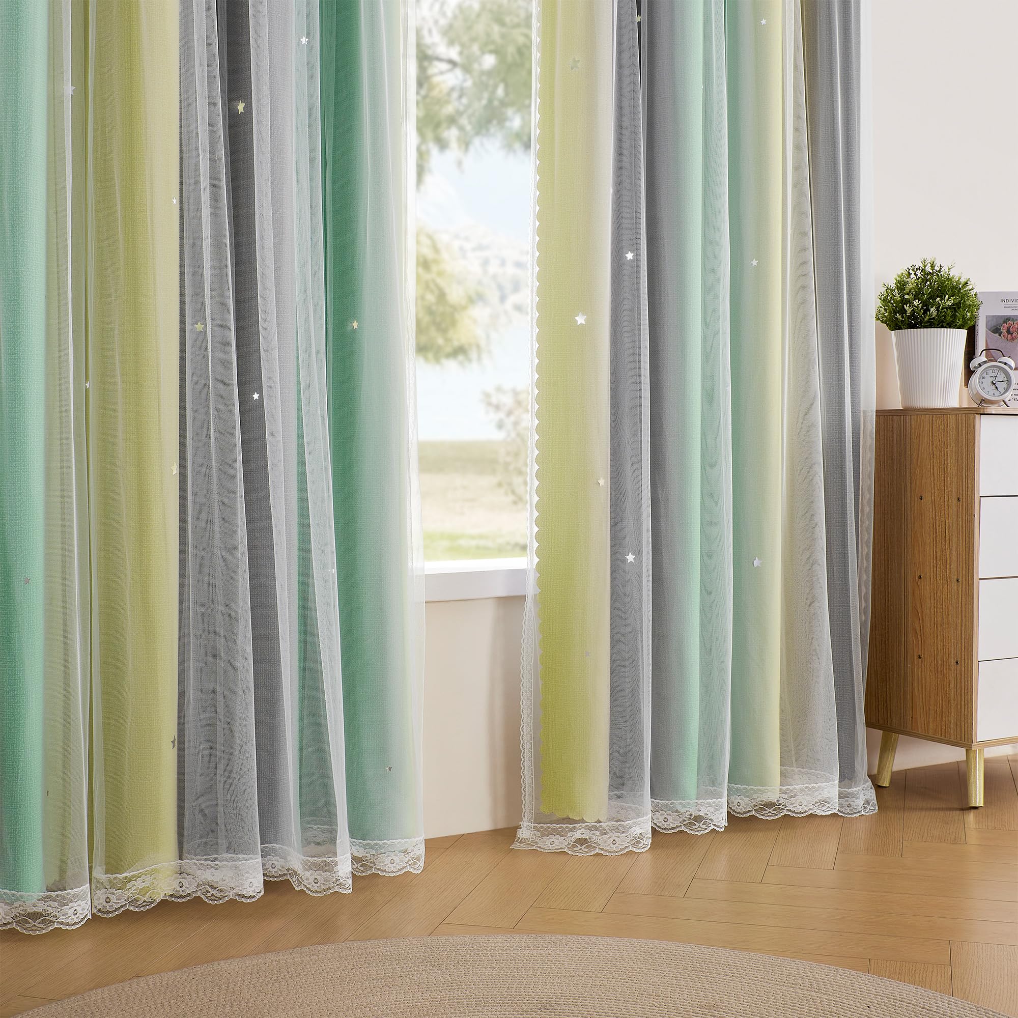 HIGH QUALITY MATERIAL: The layer of sheer curtain is made of high quality garment mesh fabric with high quality lace edges on the bottom and side edges. The blackout curtain layer is a polyester fabric with a special three-layer weaving process, only High-quality polyester fabrics can print good colors and have a nice hand, and the cut stars are more complete, curtains have better drape and 80% blackout.
