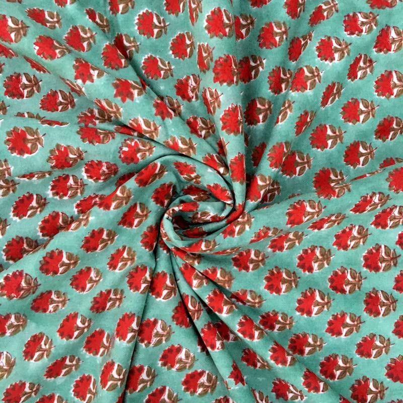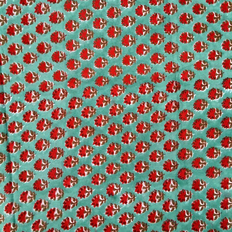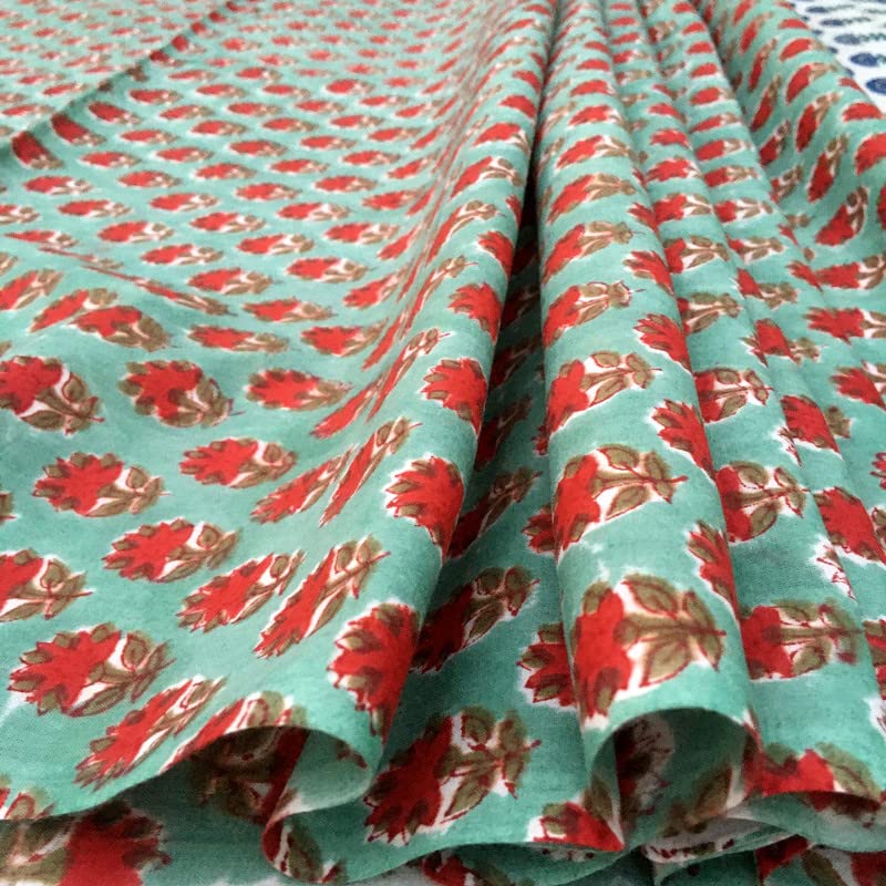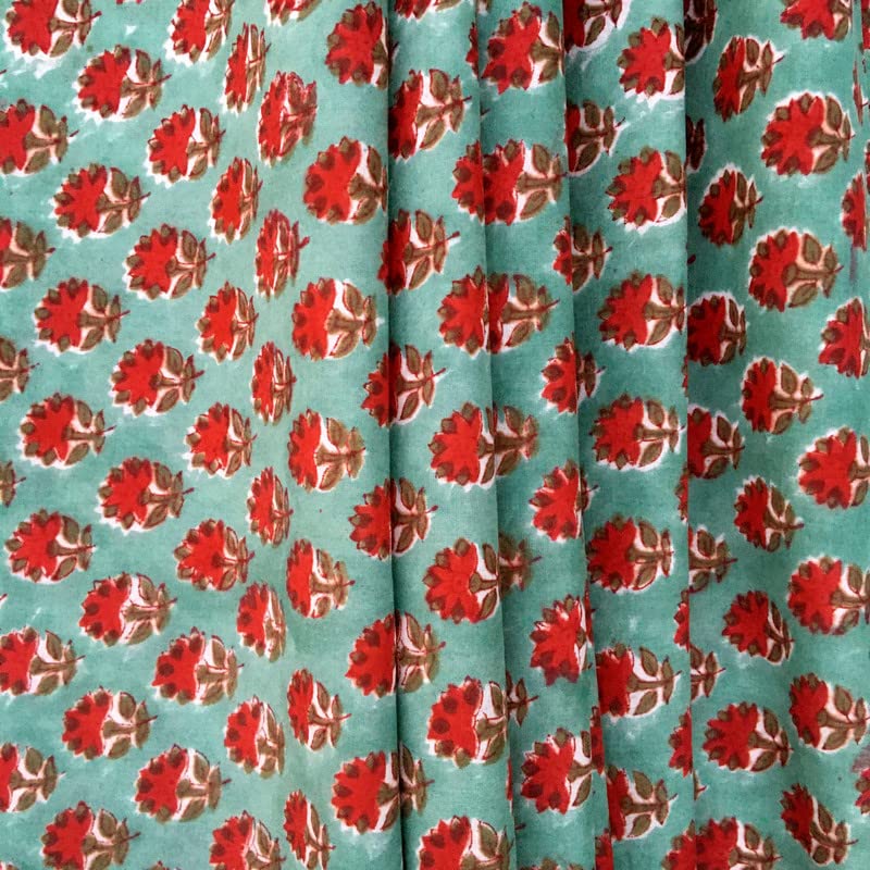 FABRIC WIDTH: 44" And LENGTH: 3 Yards. , Color: Teal Green . 100% Soft Cotton medium weight, Indian Wood Hand block fabric.