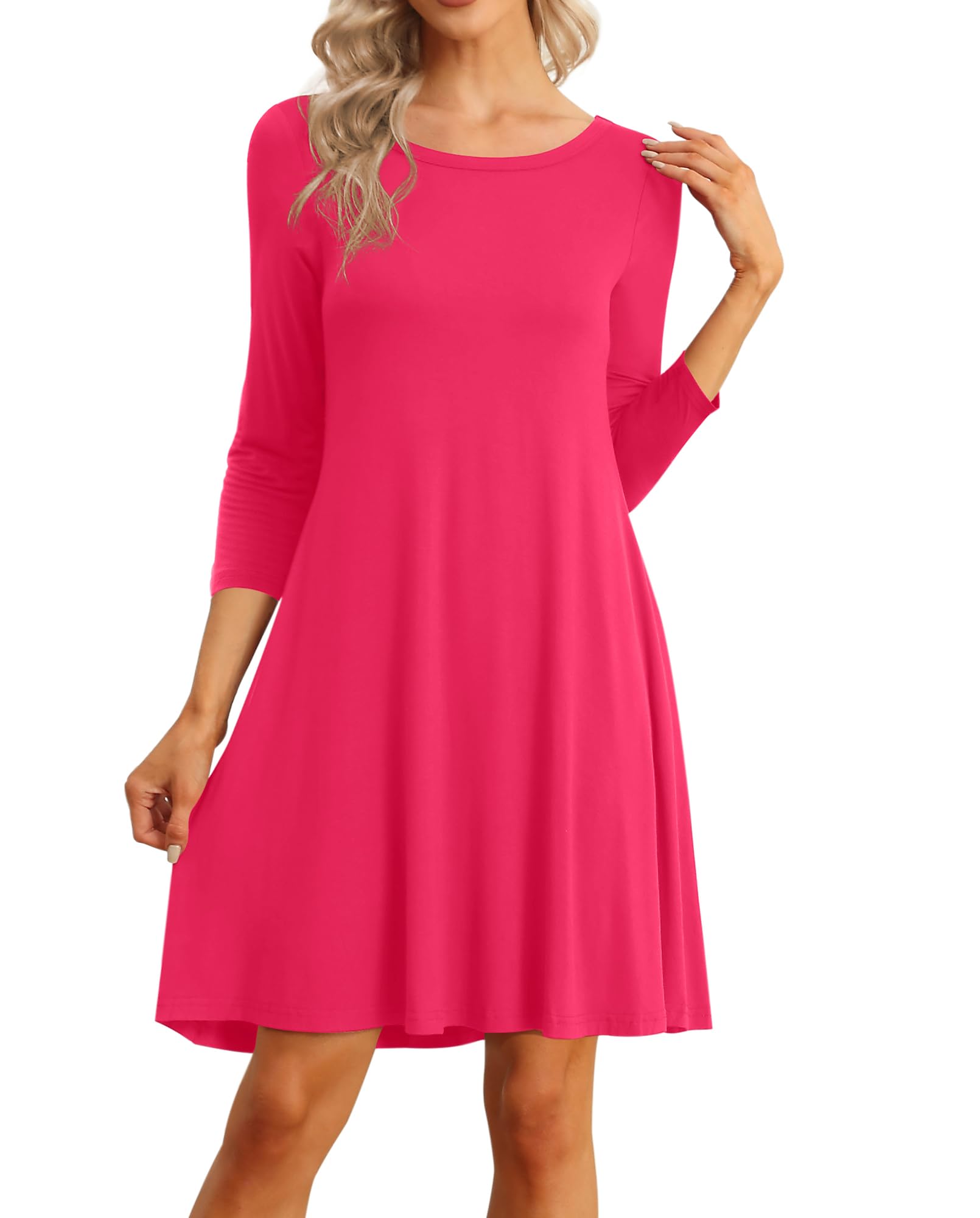 Features: casual basic style, A-line silhouette, 3/4 sleeves/sleeveless ,round neck, super soft.the casual dresses is above the knees and long enough that you wouldn't need to wear leggings with it if you didn't want too.It's a swing style so it would fit comofrtably over large hips.the pockets are such a nice addition,it's loose enough but not baggy.
