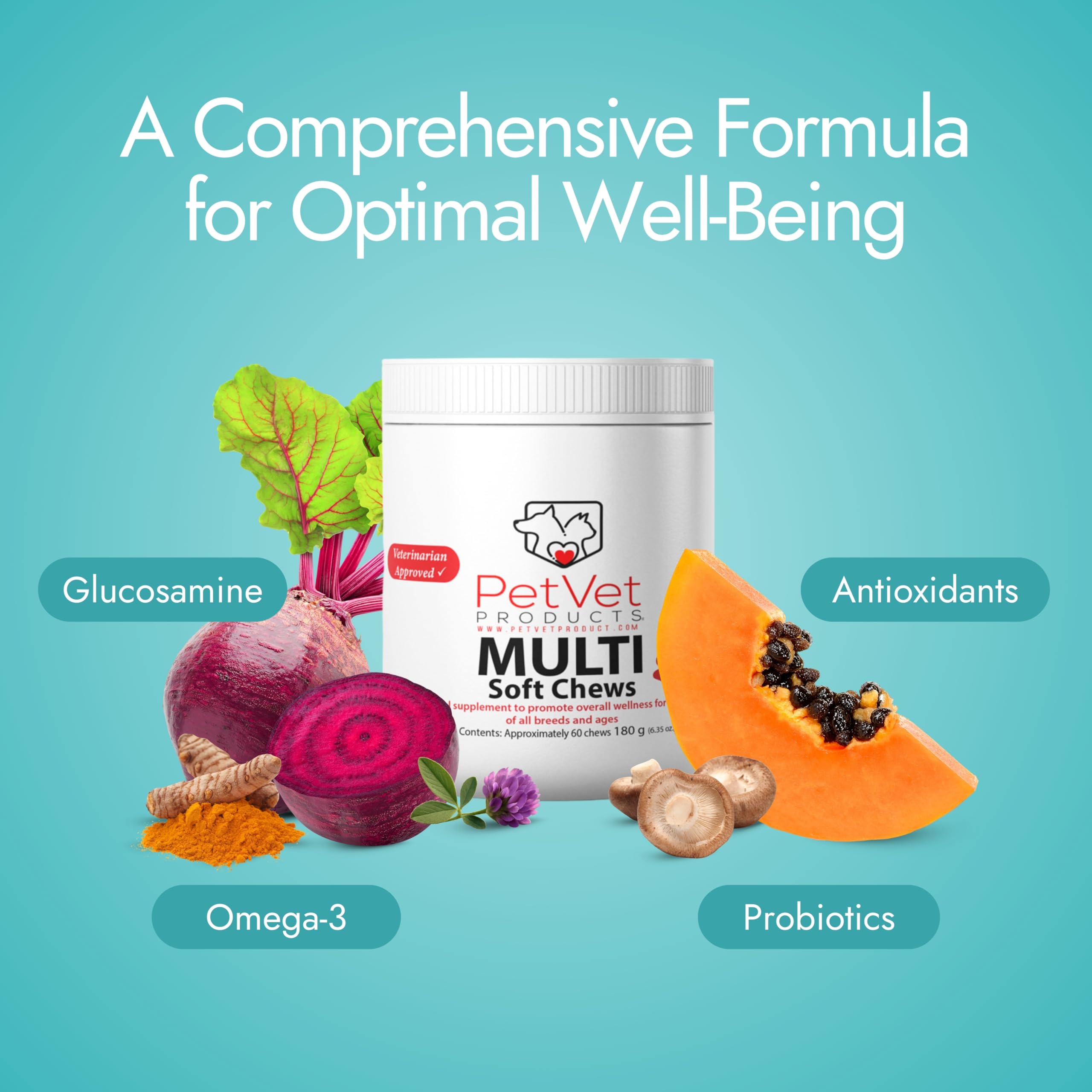 PROMOTES FAST & EFFECTIVE IMMUNE SUPPORT - Pet Vet Multi Soft Chews are formulated with a combination of essential minerals, including dog probiotics and immune support ingredients, to quickly support your dog's health. These chews work to enhance digestive health while promoting a strong immune system, helping your dog feel their best. These chews provide a fast-acting solution to improve overall vitality - dog supplements that boost health and energy.
