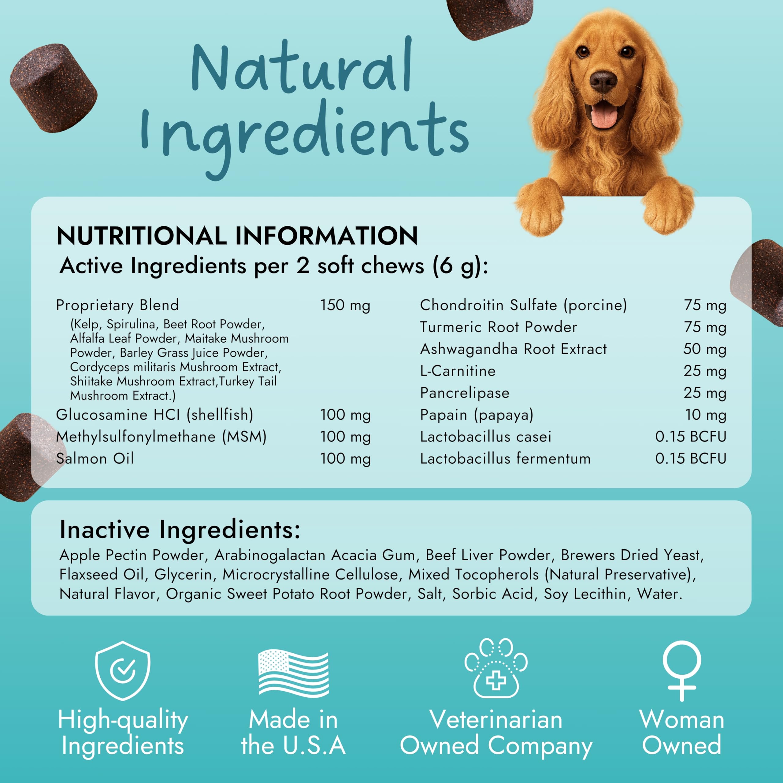 VETERINARIAN APPROVED, OWNED AND OPERATED – Crafted by a Veterinarian, Pet Vet Multi Soft Chews deliver essential dog multi to support your dog's health. These chews contain glucosamine for dogs, providing joint support to help reduce discomfort and improve mobility. The formula also promotes healthy bones, vibrant skin, and overall vitality. A trusted addition to your dog supplements collection, these chews are formulated with your dog’s best health in mind.
