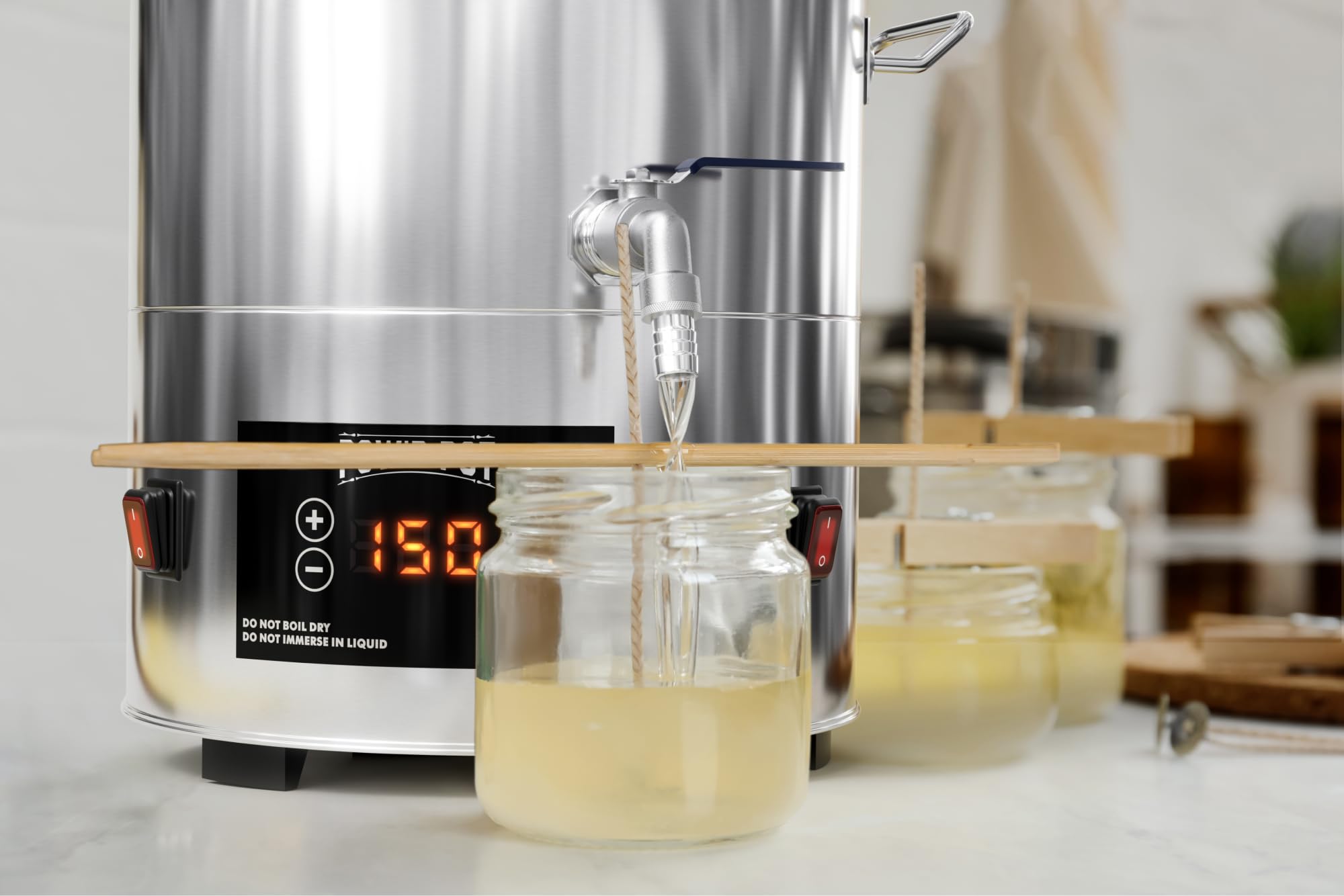 Elevate your crafting experience with the Chapman Wax Melter, a cutting-edge, versatile tool tailored for passionate hobbyists and small business owners alike. Whether you are crafting candles, lip balms, or other wax creations, the Chapman Wax Melter is your ideal companion for impeccable melting performance. Central to this innovative melter is its digital controller, offering precise temperature adjustments for unparalleled control during the melting process. This pivotal feature guarantees consistent, smooth melting of wax, leading to superior quality in your finished products. Boasting a generous 35L (9.25 gallon) capacity, the Chapman Wax Melter is perfect for both efficient and large-scale production. Its robust stainless-steel construction promises lasting durability, while the concealed heating elements safeguard against accidental contact burns. Designed for flexibility, the Chapman Wax Melter includes dual wattage settings (500/1000 Watts), adapting seamlessly to your varied production needs. Safety is paramount in its design, featuring a delayed start function and boil-dry protection, ensuring reliability and peace of mind in your crafting endeavors. Choose the Chapman Wax Melter for a safer, more effective, and precision-driven approach to wax melting. More than just a tool, it's a transformative addition to your wax crafting arsenal. Important Note: When melting wax, you may encounter an E3 error. The E3 error indicates activation of the dry boil sensor, a built-in safety measure. This usually happens when the wax doesn't melt quickly enough, leaving the sensor uncovered. Typically, the sensor activates every 60 seconds. For optimal results, we suggest melting a small portion of wax separately and introducing it to the Digiboil prior to adding the majority of your unmelted wax.